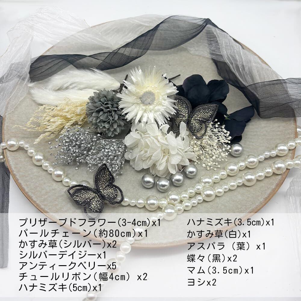 【セット内容】アジサイ、パールチェーン、マム、蝶々、かすみ草、シルバーデイジー、カスピア、ラグラス、チュールリボン、ベリーピック、マム、ゴールド花。セット内容は6枚目の画像をご参照ください。