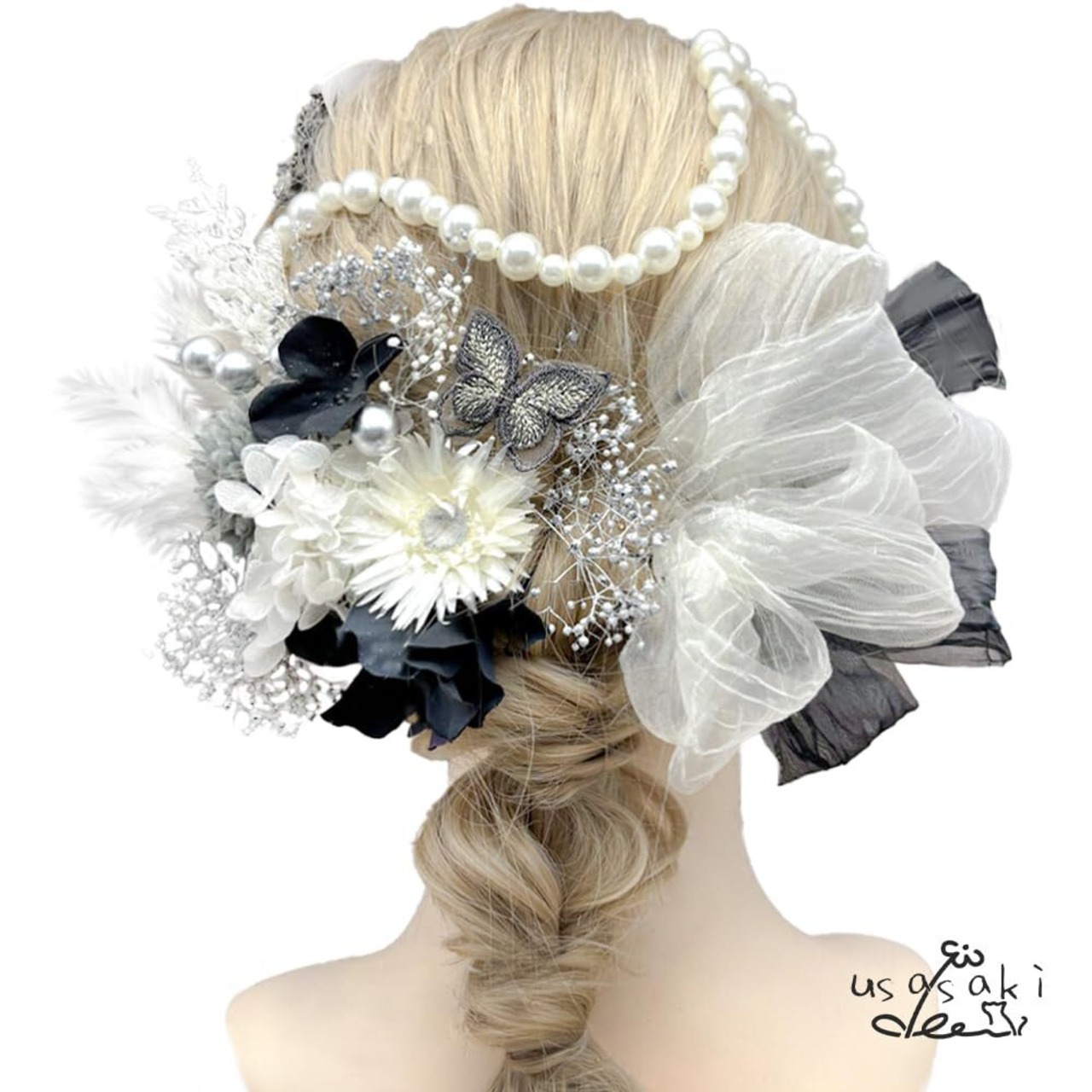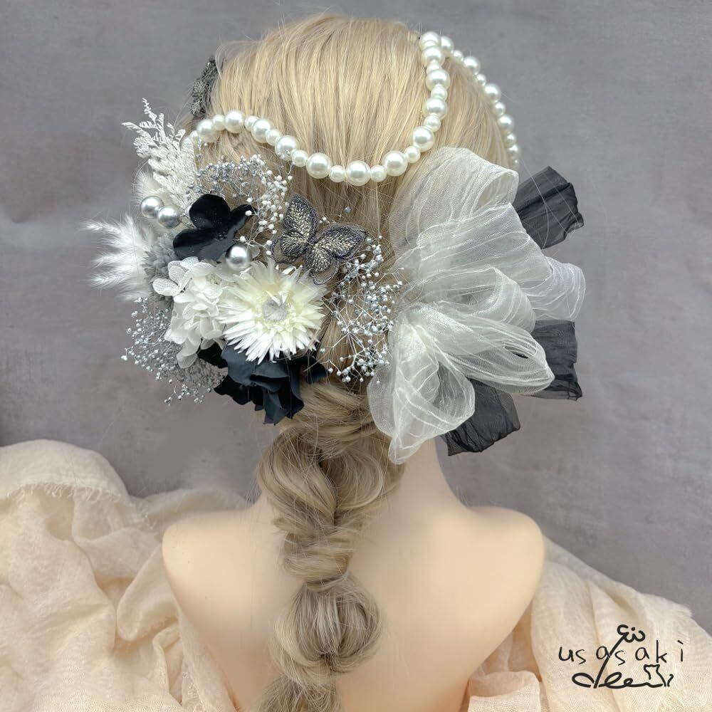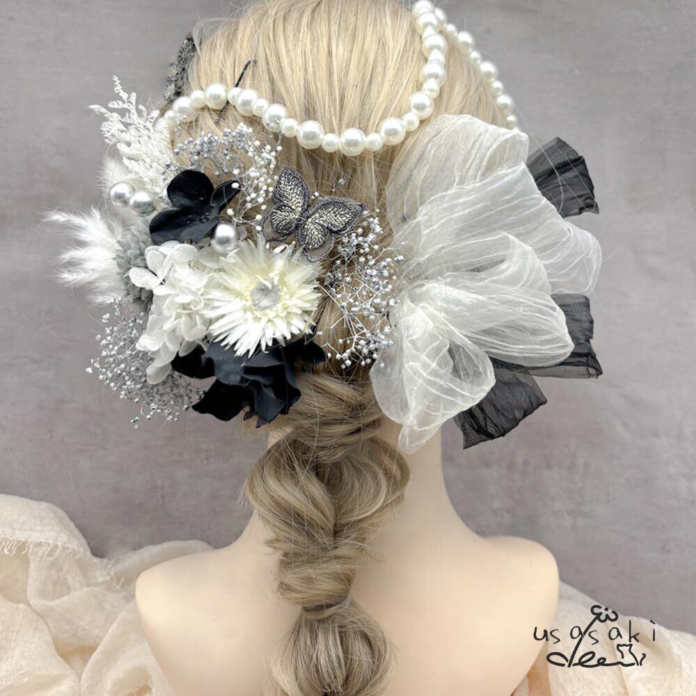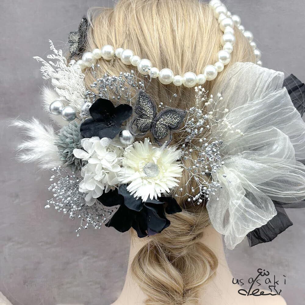 髪飾り 成人式 前撮り マム アジサイ 卒業式 入学式 カスミ草 ドライフラワー振袖 袴 ウェディング 結婚式 和装 赤 白 黒 ベリーピック パールチェーン 蝶々 ヘアアレンジ ハーフアップ ロングヘア A24110006-02