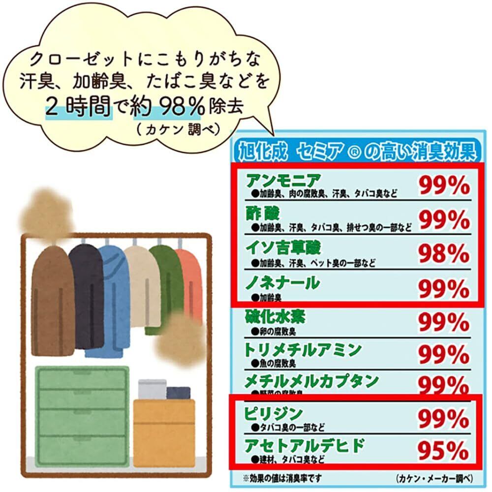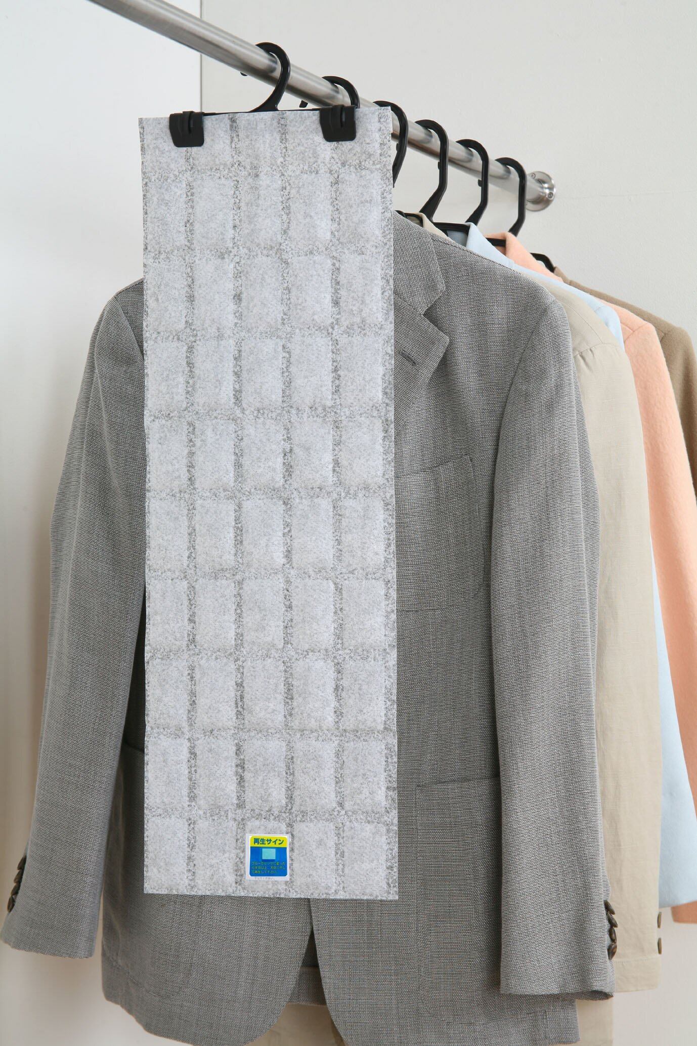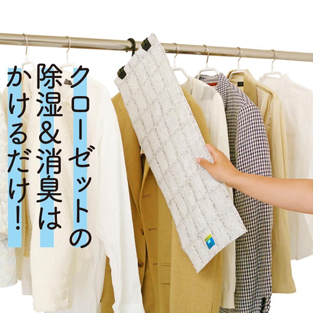 ●旭化成セミアS-3・B型シリカゲルを使用した強力消臭&除湿シート.クローゼットに入っている衣類の臭いや湿気を強力に吸い取る<br>●セミアS-3』は四大悪臭(肉、卵、野菜、魚の腐敗臭)はもちろん、タバコ臭、ペット臭等多くの複合臭に対応する<br>●『B型シリカゲル』は吸湿と放湿の機能を持った除湿剤で、天日干しで繰り返し効果を発揮する<br>●天日干しの時期の目安が一目でわかるインジケーター(判定シール)付き,ブルーがピンクに変われば天日干しのサイン<br>●吊り下げ型ハンガー付き<br>●使用目安:一間幅クローゼット(約幅2×高さ2×奥行1m)<br>●はさみで切って使用できます