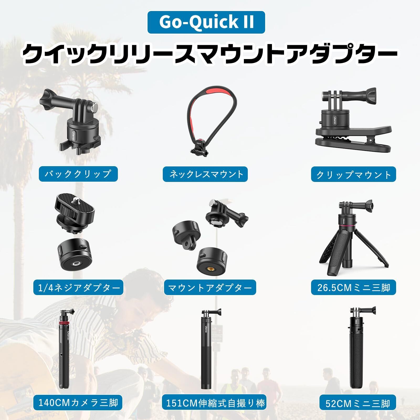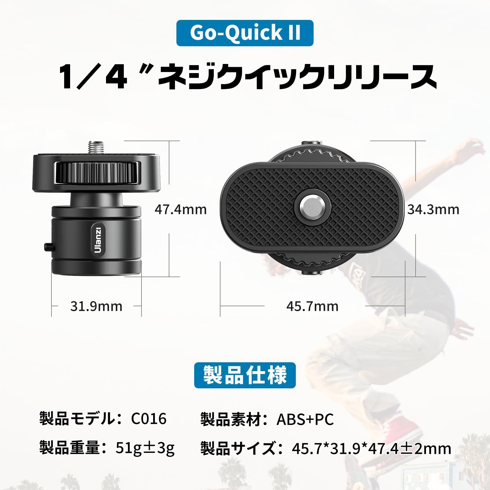 【超便利なマグネット仕様 簡単取付】クイックリリース1/4インチネジアダプターは様々なアクセサリーに装着して使用して、アクセサリーからカメラを外して保管・持ち歩く際に非常に便利です。Go-Quick II クイックリリースクリップマウントアダプターはワンタッチで接続できます。これがあると付け替えのたびにネジで締め込んだり緩みたりする必要がなくなります。Go-Quick IIのベースと接続アダプターに強力な磁石が内蔵されているので、アクションカメラを使っても落ちないから安心です。また、この磁気マグネットデザインは、すべてのGo-Quick IIシリーズ製品に適合しています。