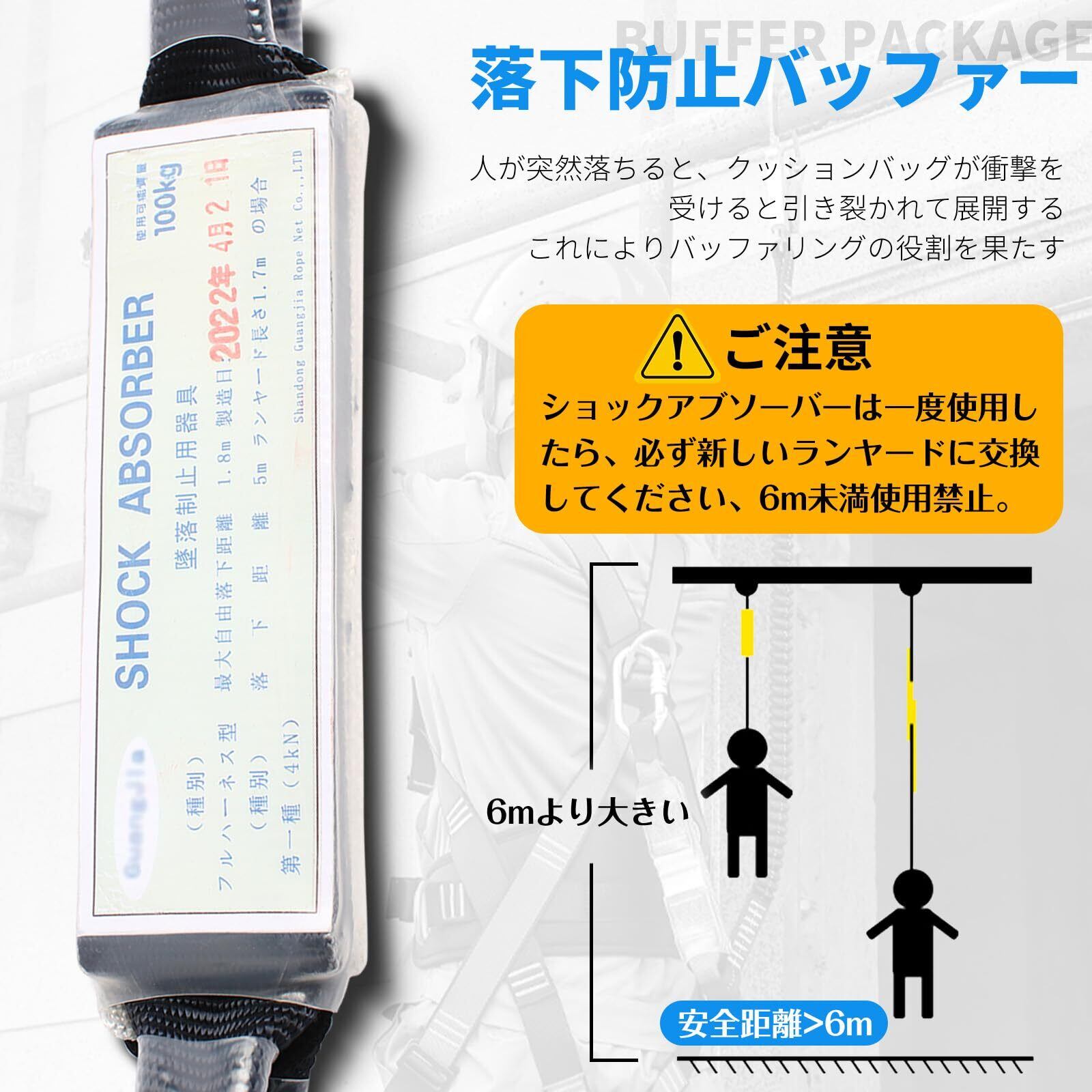 【合金製フック/伸縮式ハーネス】①航空のクロムメッキ鍛造スチールフックを採用しており、熱間鍛造フックはより大きな衝撃力に耐えることができ、強度を確保しながら可能な限り軽量化を図りました、建設をより安全にします。 ②墜落制止用器具 胴ベルト型 1丁掛けの平ベルト接続部は複数の補強ステッチを採用し、強度が高く張りが強く、縫製が滑らかなのが特徴で、安全ロープの寿命と安全性を向上させます。③胴ベルト型ランヤード仕様:ランヤード長さ:約1.1m、伸長時:約1.6m。参考適合身長:165㎝~185㎝。新規格安全帯約重量:1.1kg、使用可能質量:100kg以下。引張強度約2200KG(22KN)ランヤードの種別:第一種/最大自由落下距離:2m。④ハーネス安全帯は使わない時に短く縮んでいますので、移動時の引っ掛かりなどを抑えることがありません。安全帯は伸縮式ベルトで作業中も邪魔になりづらいです。