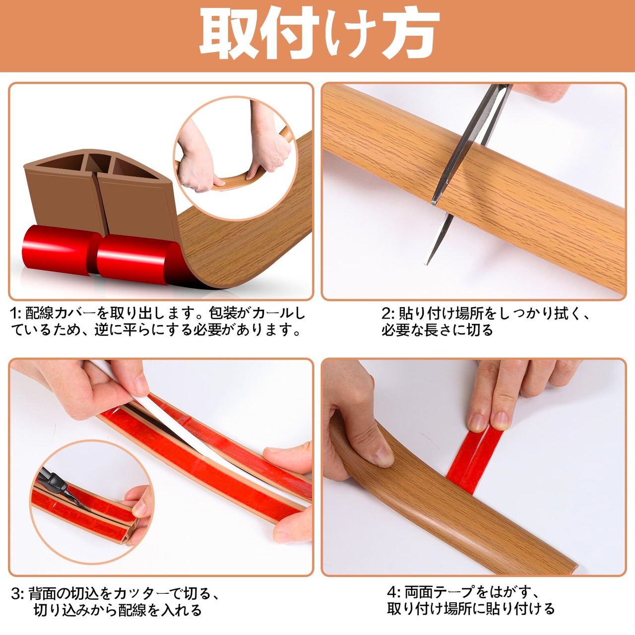 【簡単に操作】ケーブルカバー底部開けて、コードをカバーの中に入れます。床を綺麗に掃除して、赤いシールをはがして地面に貼り付けて、取り付け完了します。電気コードプロテクターや延長コードカバーとして幅広く使用できます。(※ケーブルカバーの底部が開いているため、ハサミで切る必要がありません。)