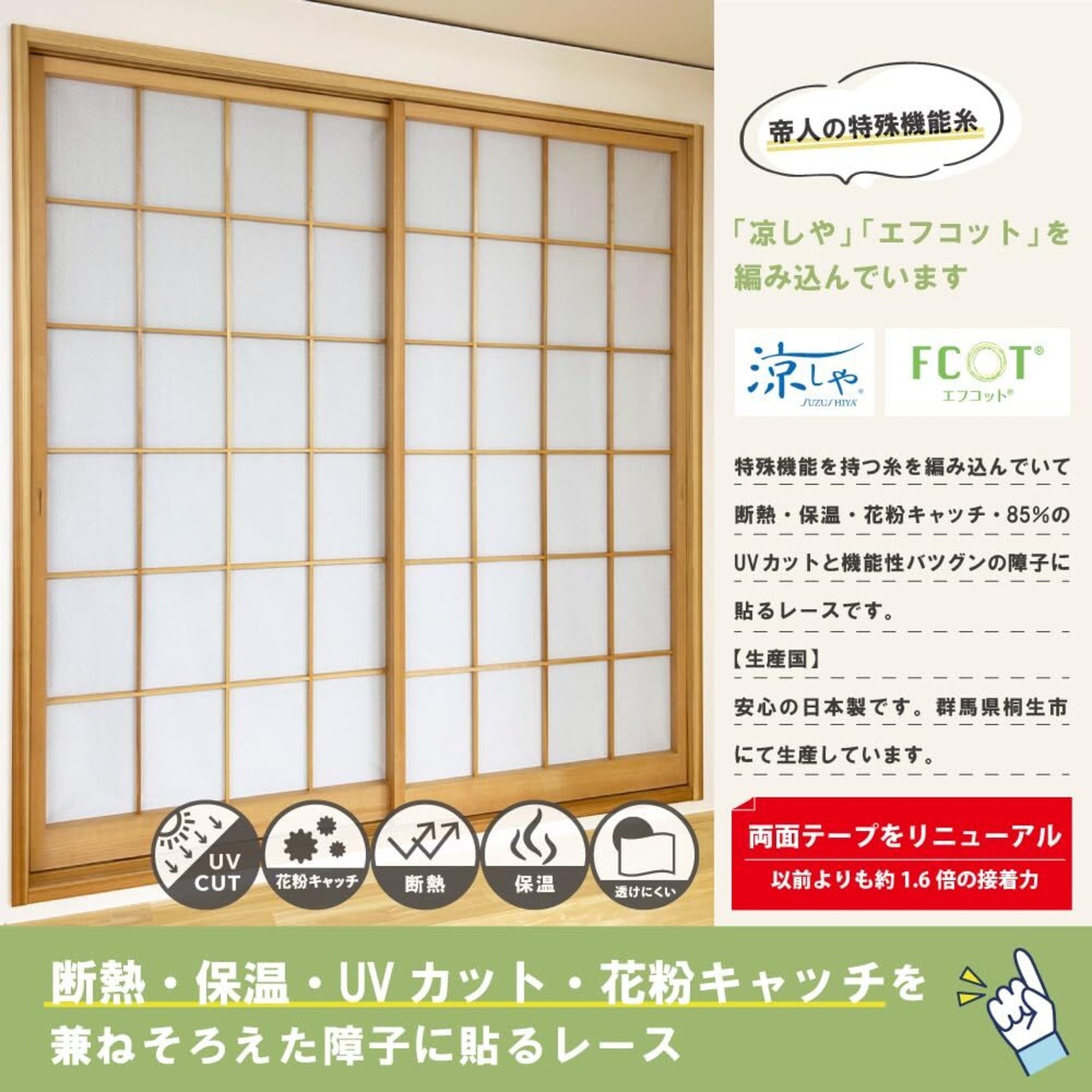 【仕様】光と風を通す多機能なレース障子です。夏は遮熱効果、冬は保温効果があります。また花粉キャッチ機能で外から室内への花粉やホコリの進入を抑えます。レース生地ですので、通気性や採光性に優れており、破れにくい素材なので障子紙に比べると長持ちします。
