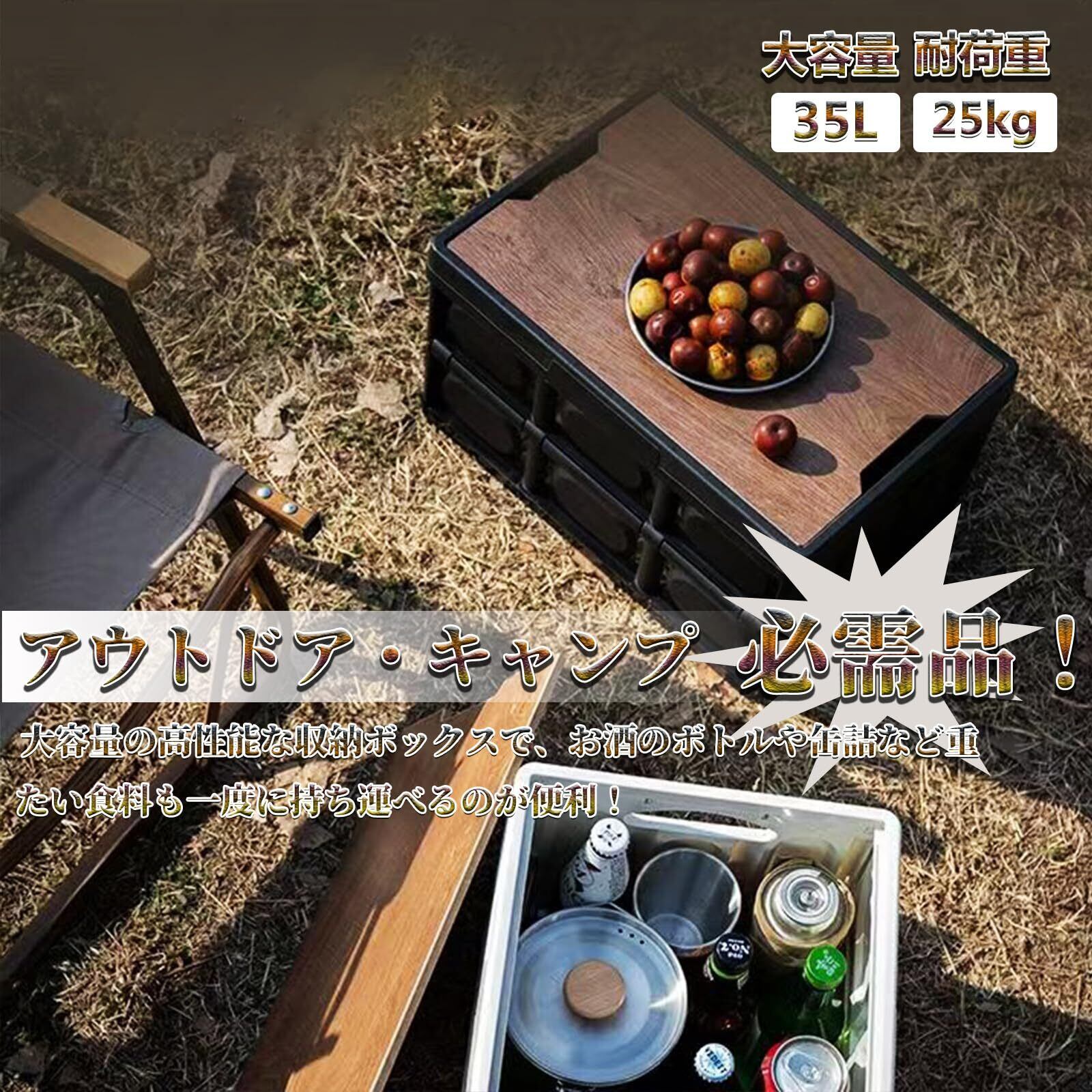 【高積載能力・優れた耐久性】35Lの折りたたみボックスの寸法は長さ43.5x幅30x高さ7cm、本体の重さは約1.3kgです。高強度の良質なPP樹脂材料を採用し、耐荷重は約25kgで、強圧過負荷下での安定性が高い。また、ボックスは蓋付と留め具付きで、防塵、防カビ、 防湿、防虫などができて、優れた耐久性があります。また車載用のとき、テーブルが閉じて車内も邪魔になりません。