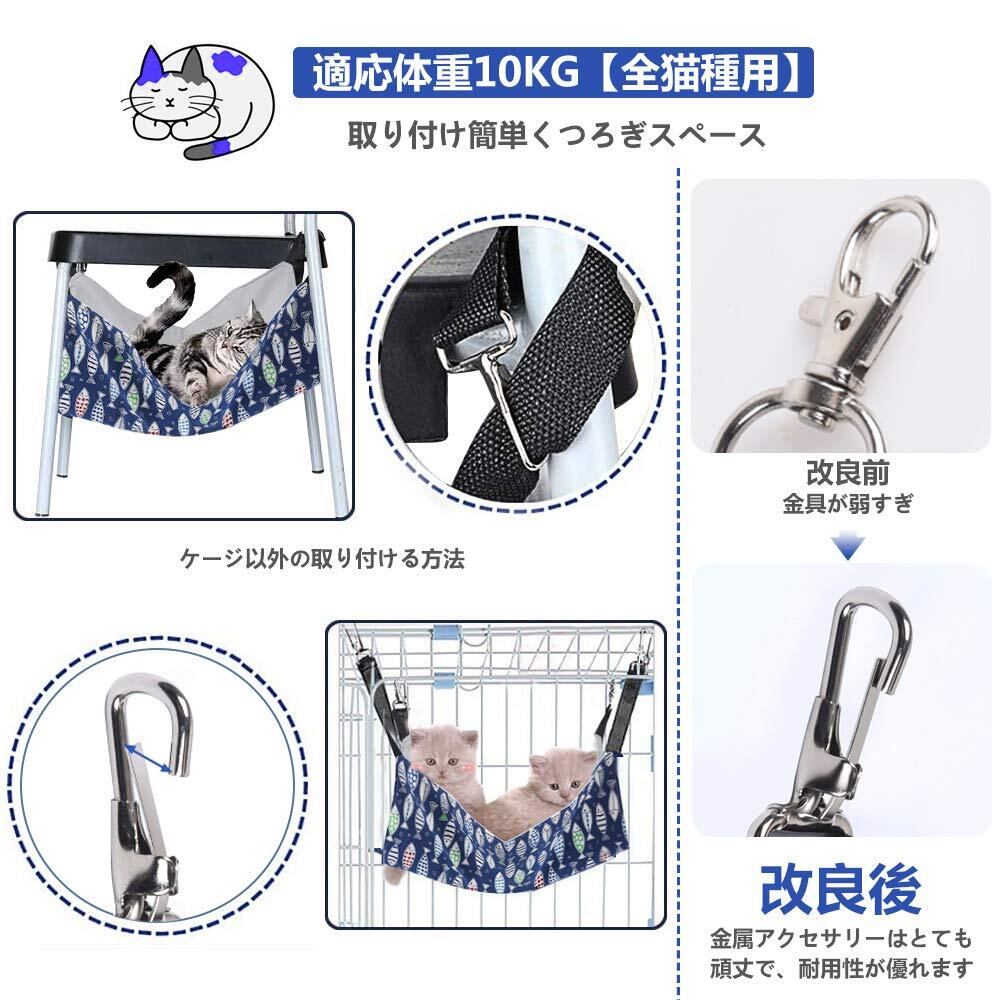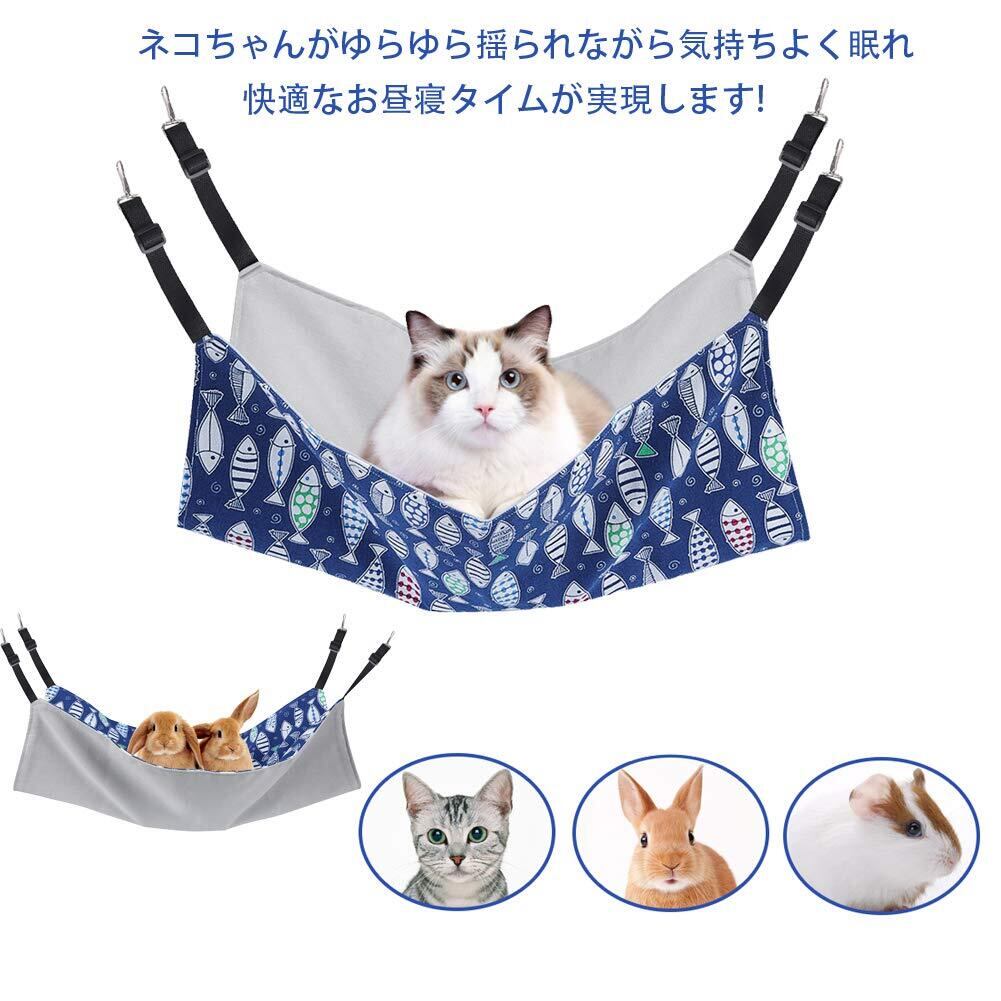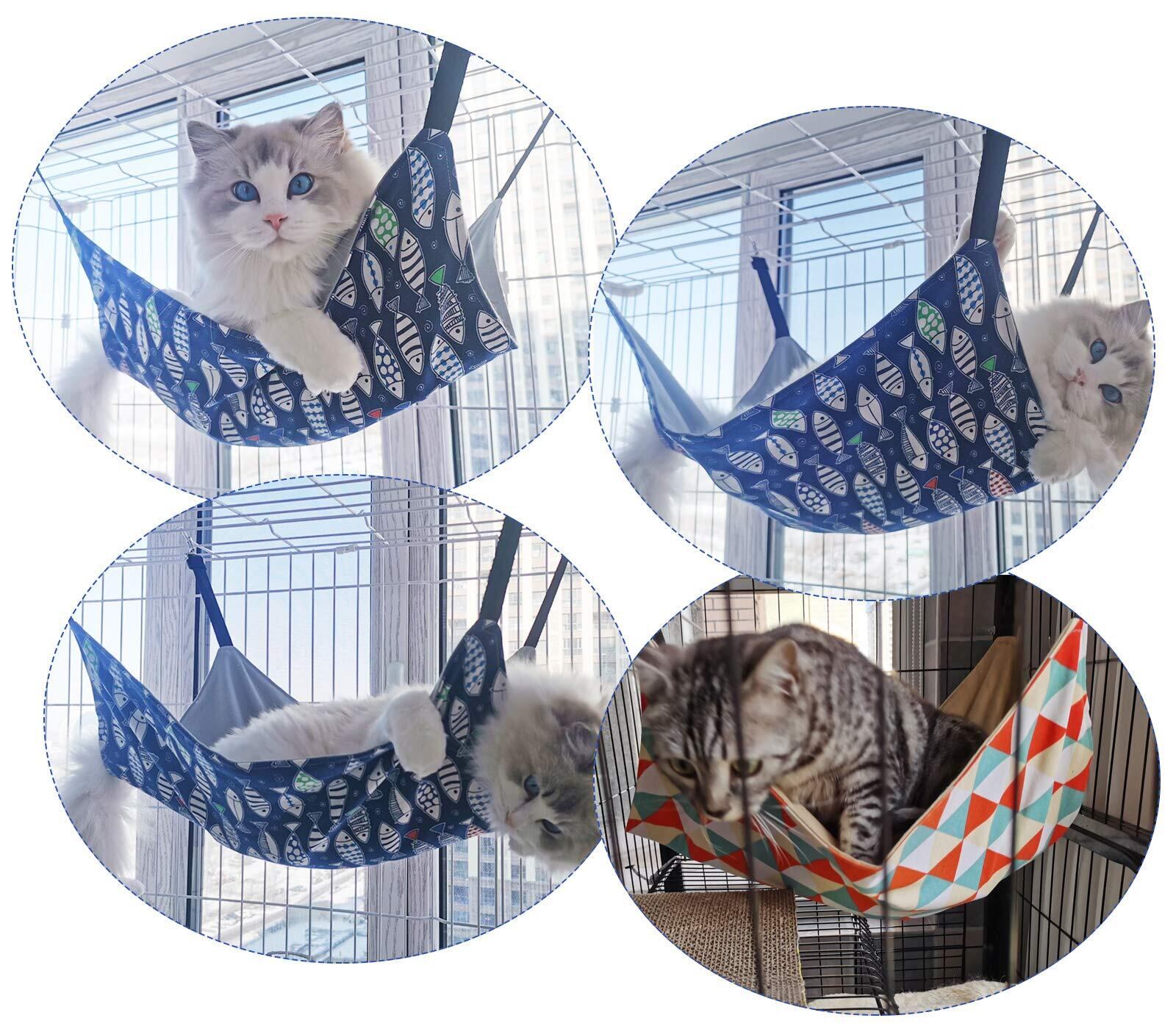 猫 ハンモック Blueekin キャットハンモック ヒモ調整可能 ペット ベッド ネコハンモック ケージ用 耐荷重10KG 大きい 56cm x 46cm 通気性 日向ぼっこ 遊び場 丸洗い 金具丈夫 夏冬両用(魚柄)