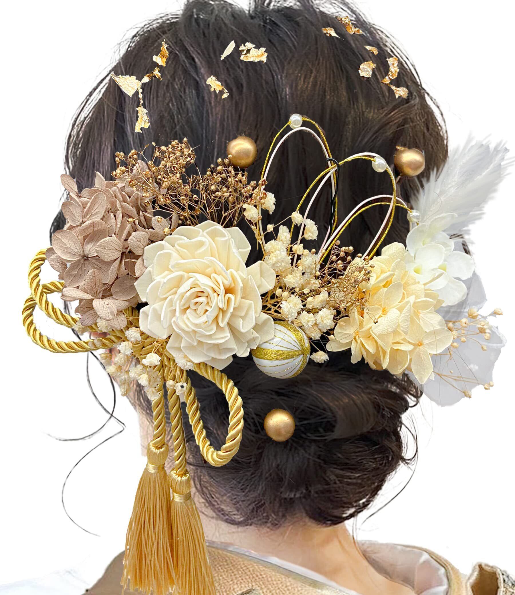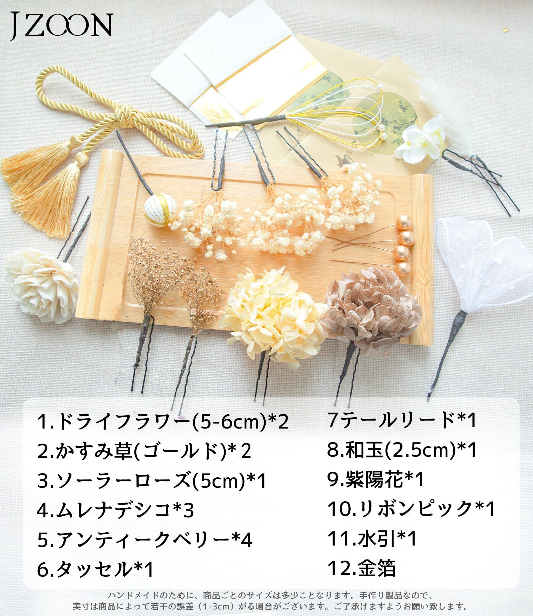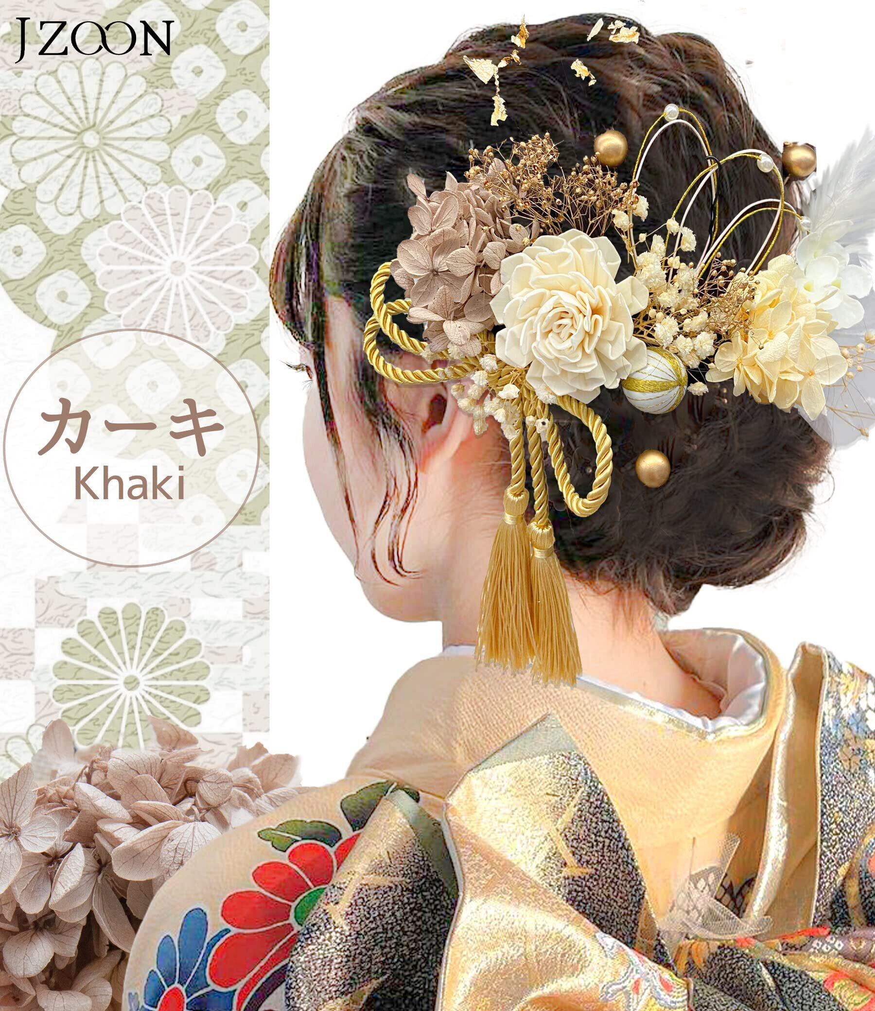 [JZOON] 成人式 髪飾り ヘアアクセサリー アジサイ テールリード ソーラーローズ アンティークベリー パール水引き 金箔 リボン タッセル 結婚式 ウェディング 卒業式 発表会 入学式 披露宴 卒園式 お祭り 和装 振袖 浴衣 上品 おしゃれ T1208 カーキ