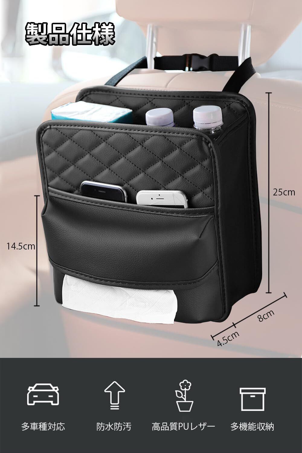 【車内スペースを節約】車の座席の背面に掛けられる収納バッグと、車用ティッシュボックス兼ゴミ箱として使えるデザインです。ティッシュ、保温カップ、傘、IDカード、携帯電話、メガネ、その他の小物を収納可能です。