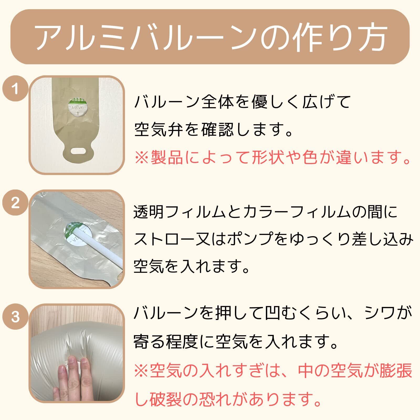 【セット内容、サイズ】数字バルーン×1(高さ約90cm)、HAPPY BIRTHDAY白風船×1(大きさ約25cm)、TO YOU白風船×1(大きさ約25cm)、クリアドットバルーン×2(大きさ約25cm)、グレーバルーン×2(大きさ約25cm)、グレージュバルーン×2(大きさ約25cm)ペタンコの状態でお届けです。ゴム風船には予備が付いているので万一の時にも安心です。膨らませ過ぎや静電気、温風などにはご注意ください。中の空気が膨張して破裂する可能性がございます。
