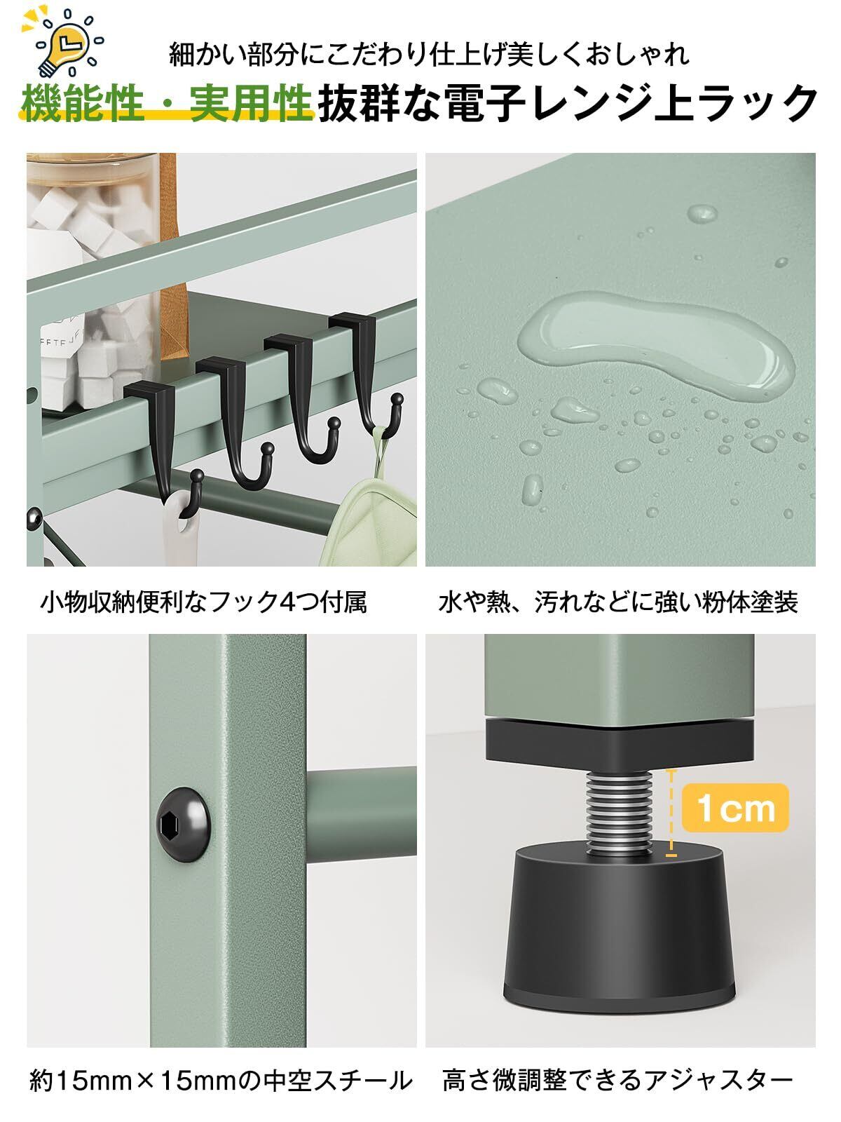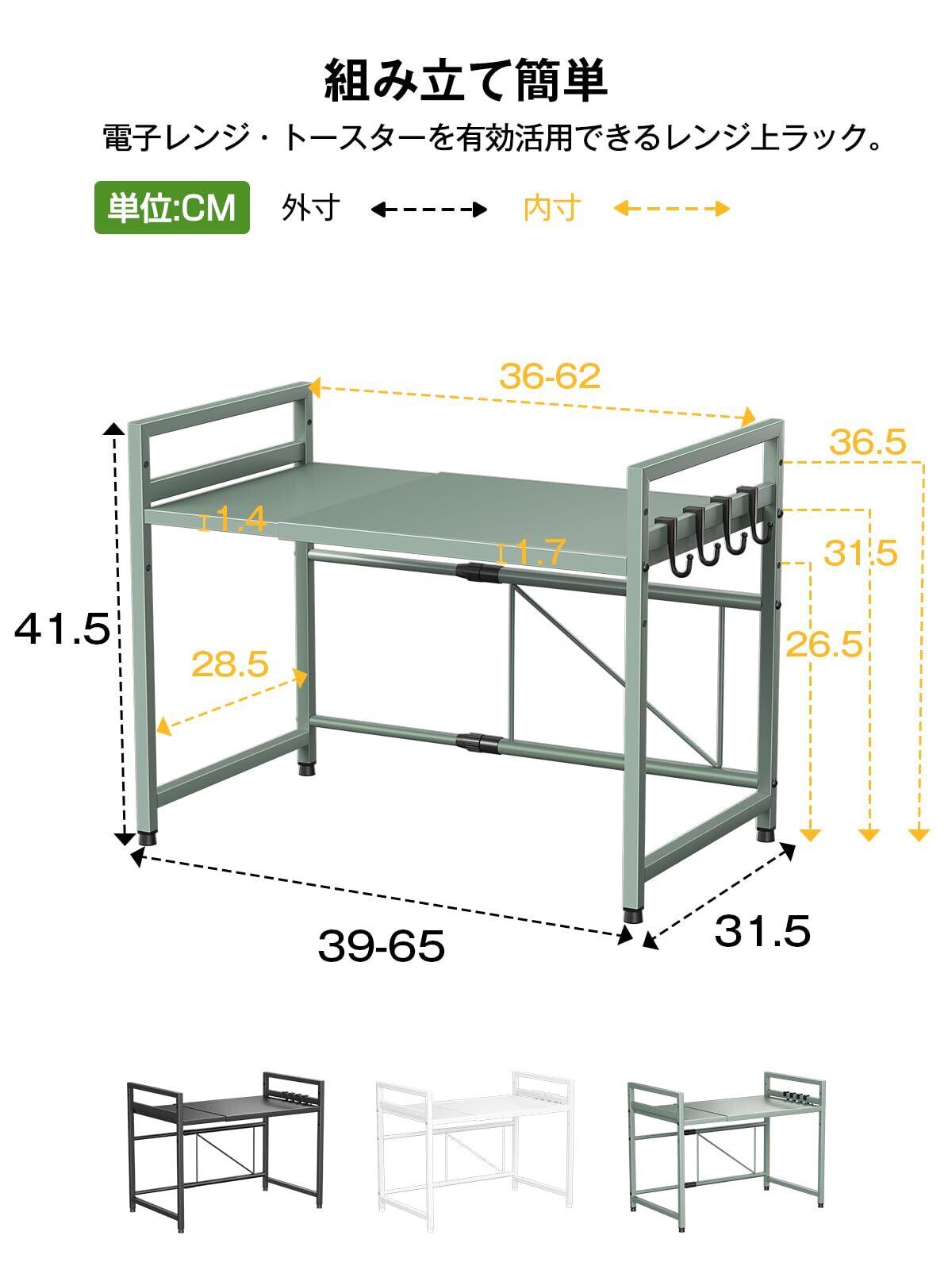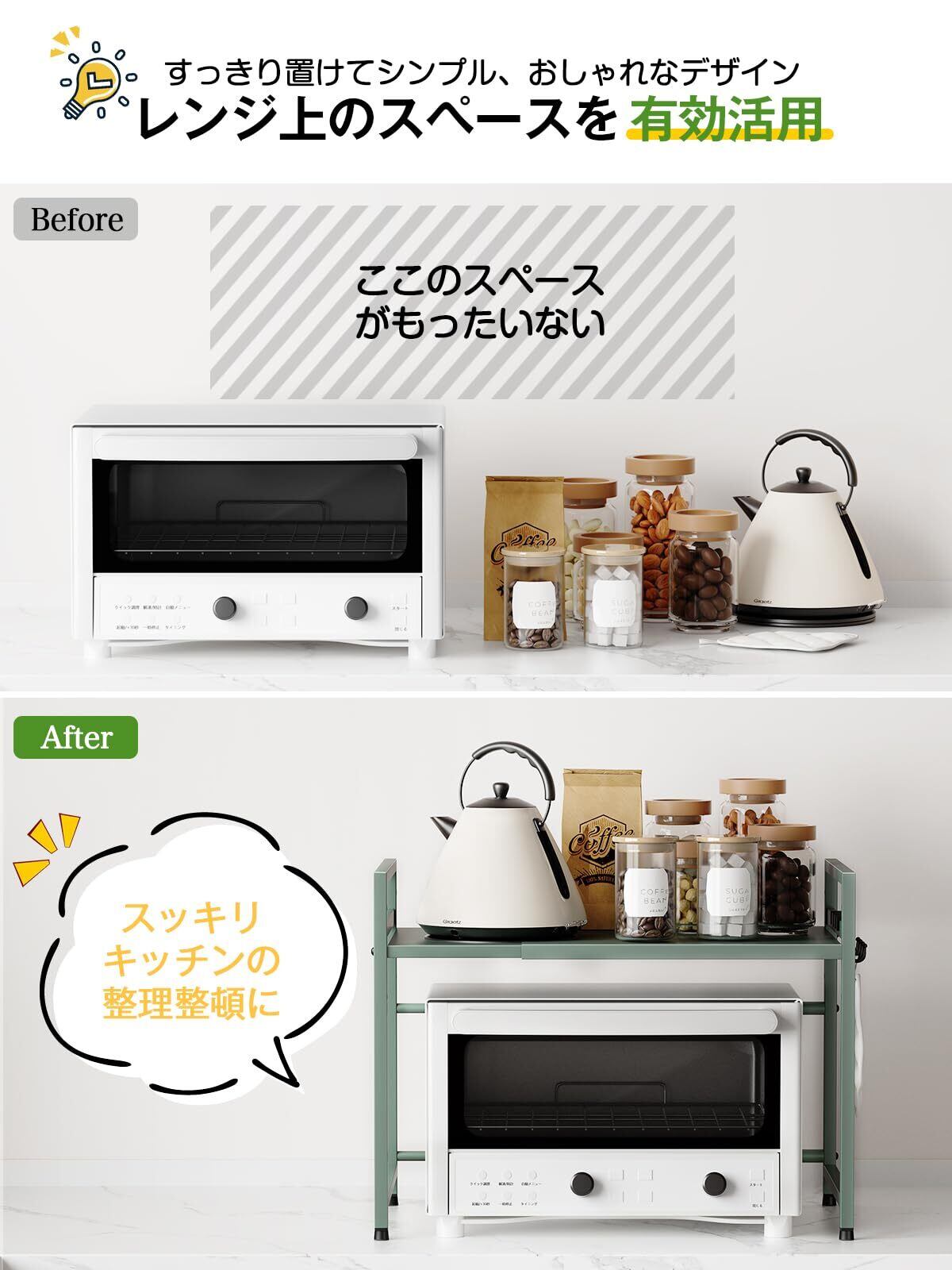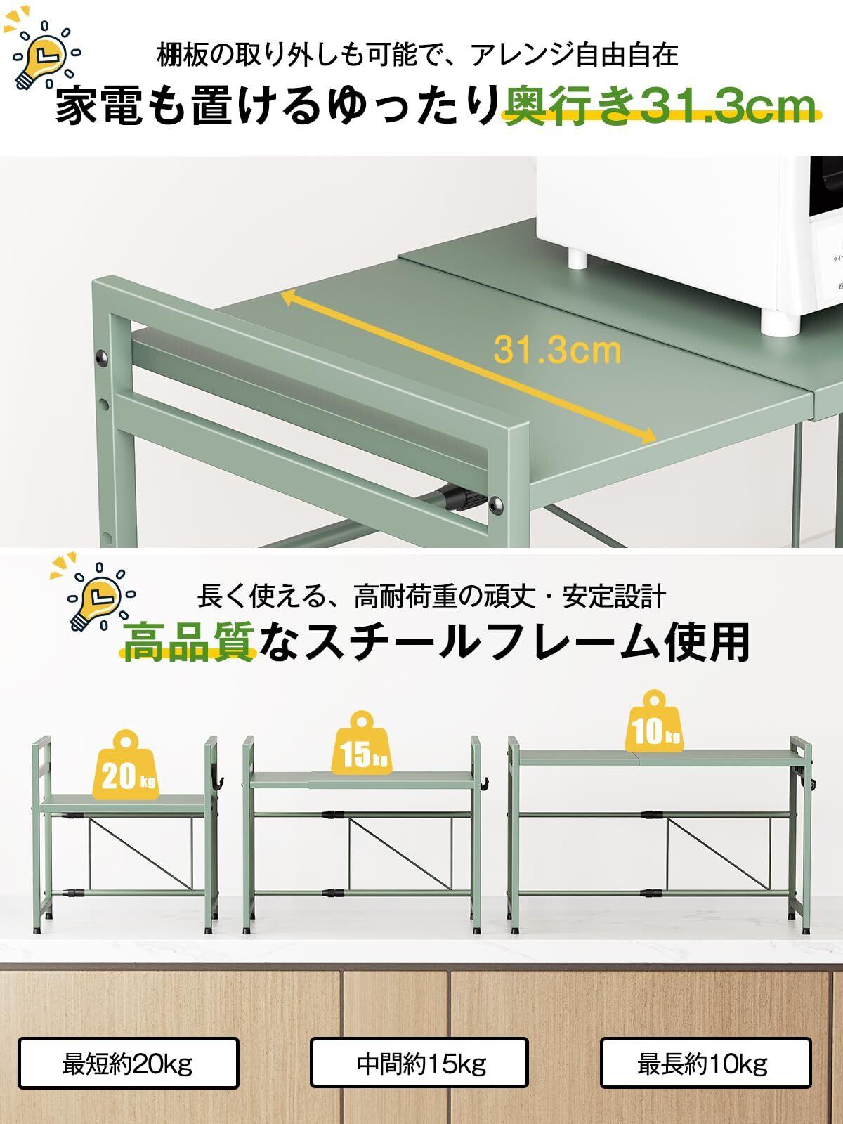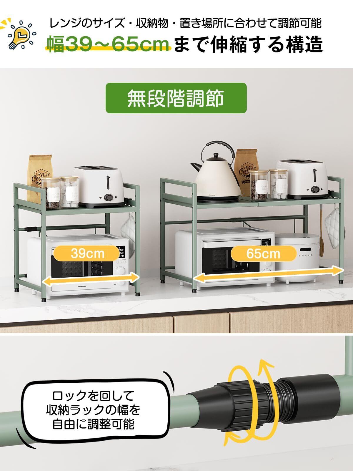TKUIN レンジ上ラック キッチン 伸縮式 トースターラック 幅(39-65cm) 伸縮可 オーブンレンジラック 棚板高さ調節可 電子レンジ 台 収納 耐荷重50kg フック4つ付き 組み立て簡単 おしゃれ (グリーン)