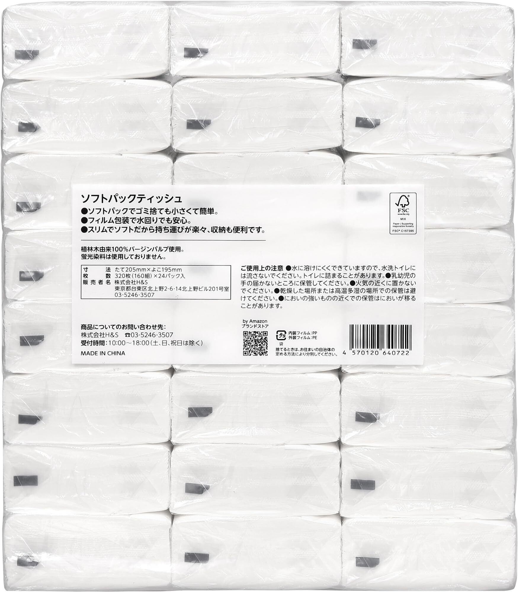 by Amazon ソフトパックティッシュ 320枚160組(2枚重ね) x 24パック入 ホワイト