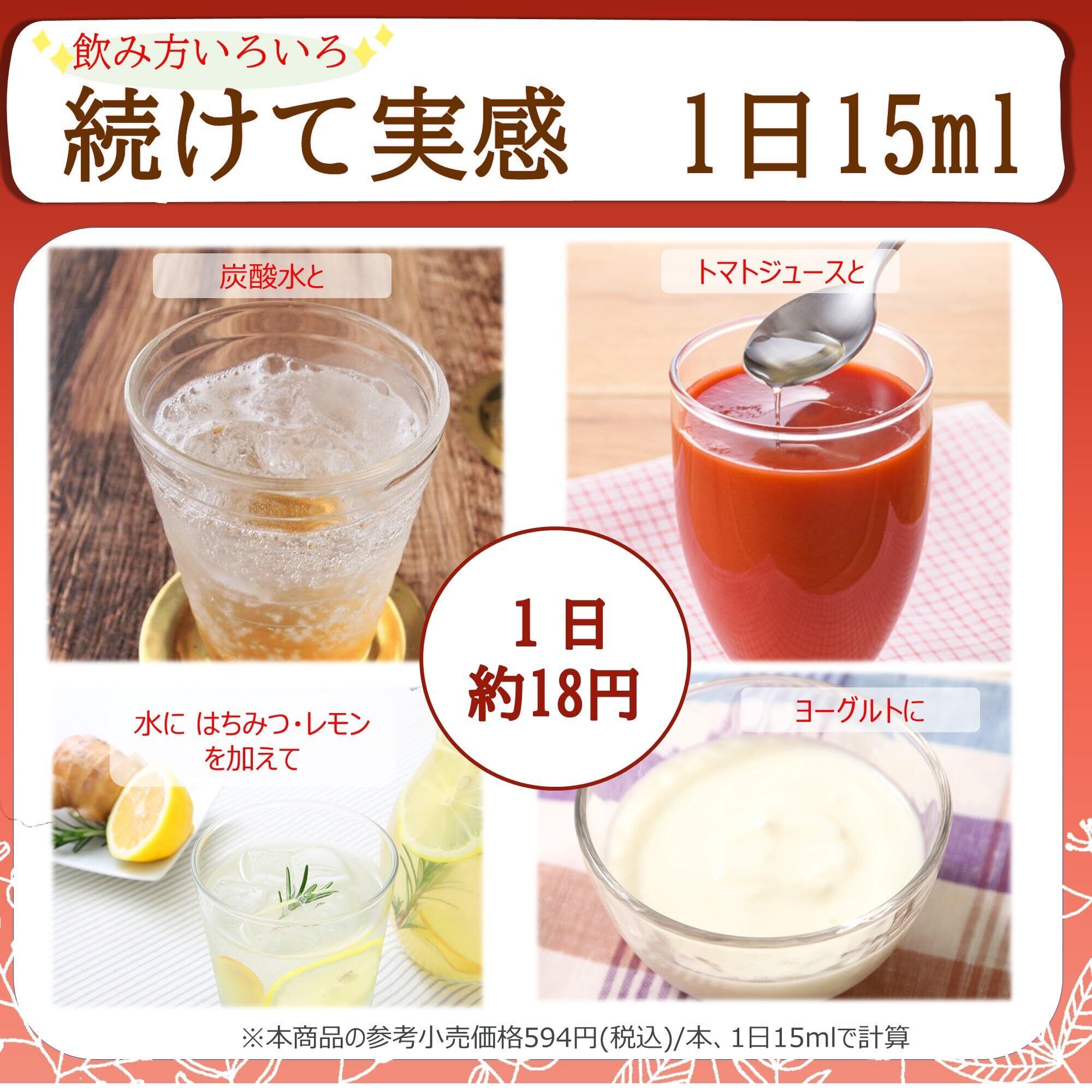 栄養成分:大さじ1杯15ml当たり エネルギー:4.7kcal、たんぱく質:0g、脂質:0g、炭水化物:1.4g、食塩相当量:0.001g