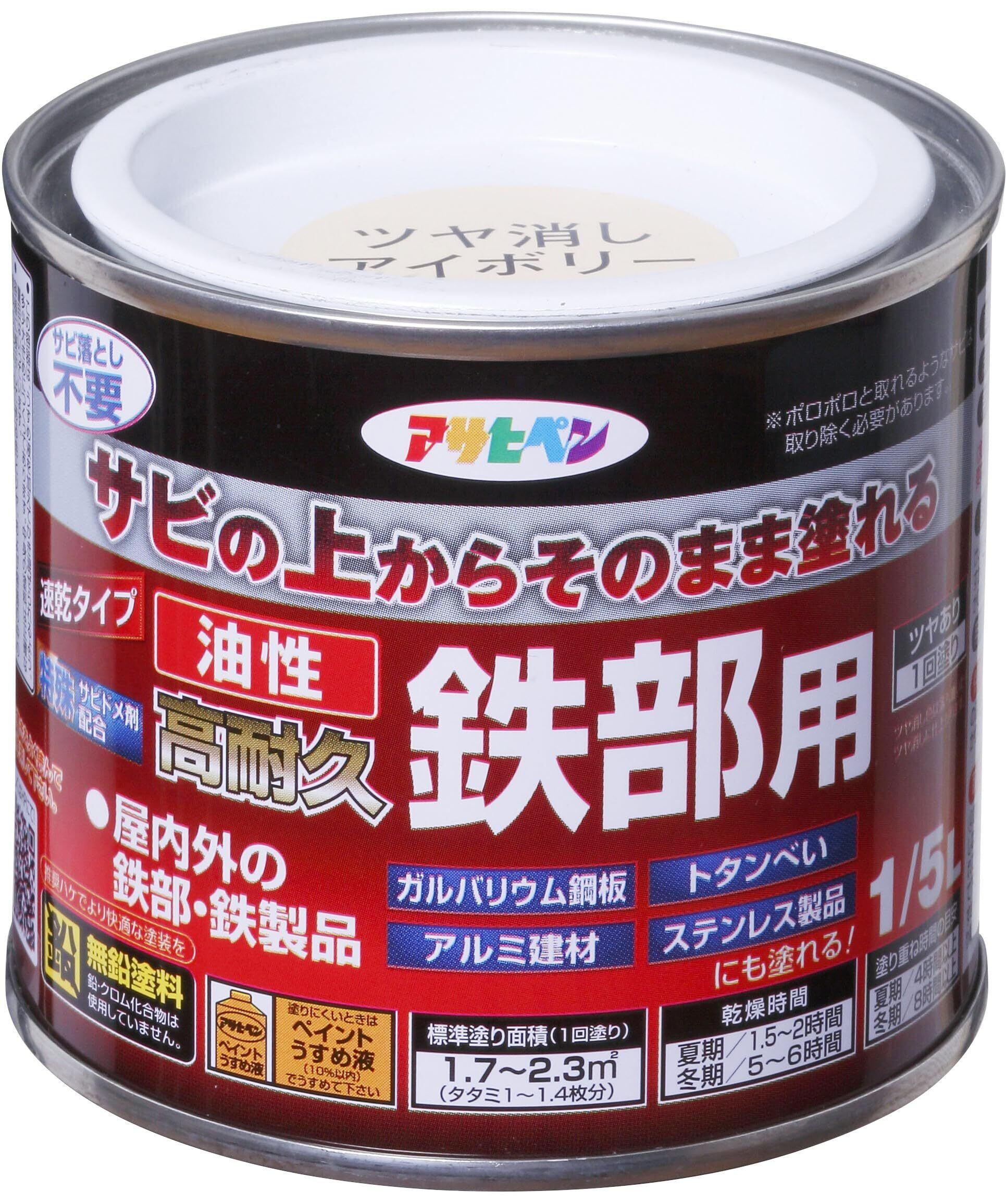 アサヒペン 塗料 ペンキ 油性高耐久鉄部用 1/5L ツヤ消しアイボリー 油性 サビの上からそのまま塗れる 艶消し 1回塗り 高密着性 耐候性 日本製