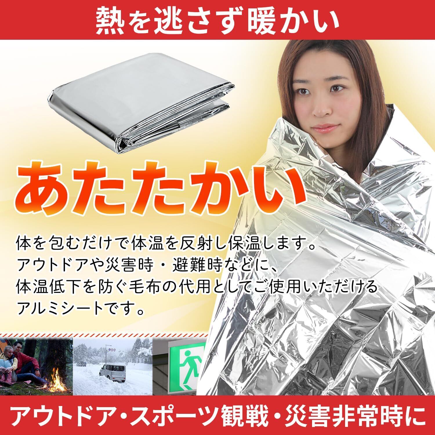 また外からの温度の侵入を防ぐことができます。 夏の高温を遮断することも期待できるため、暑さ対策としてのご使用も可能です。 緊急時での寒さ対策以外に、登山やスポーツ観戦にも常備しておくと便利です。 いざという時や災害時に、非常バッグにこのサバイバルシートが一つでも入っていれば 体に巻いて寒さをしのげます。
