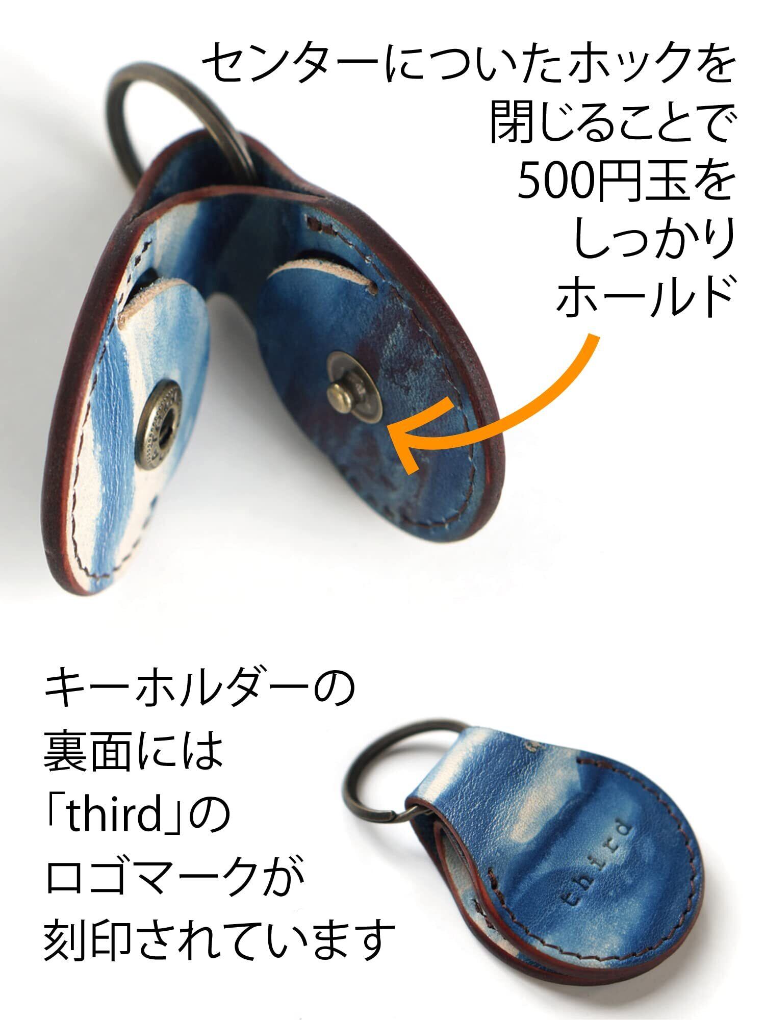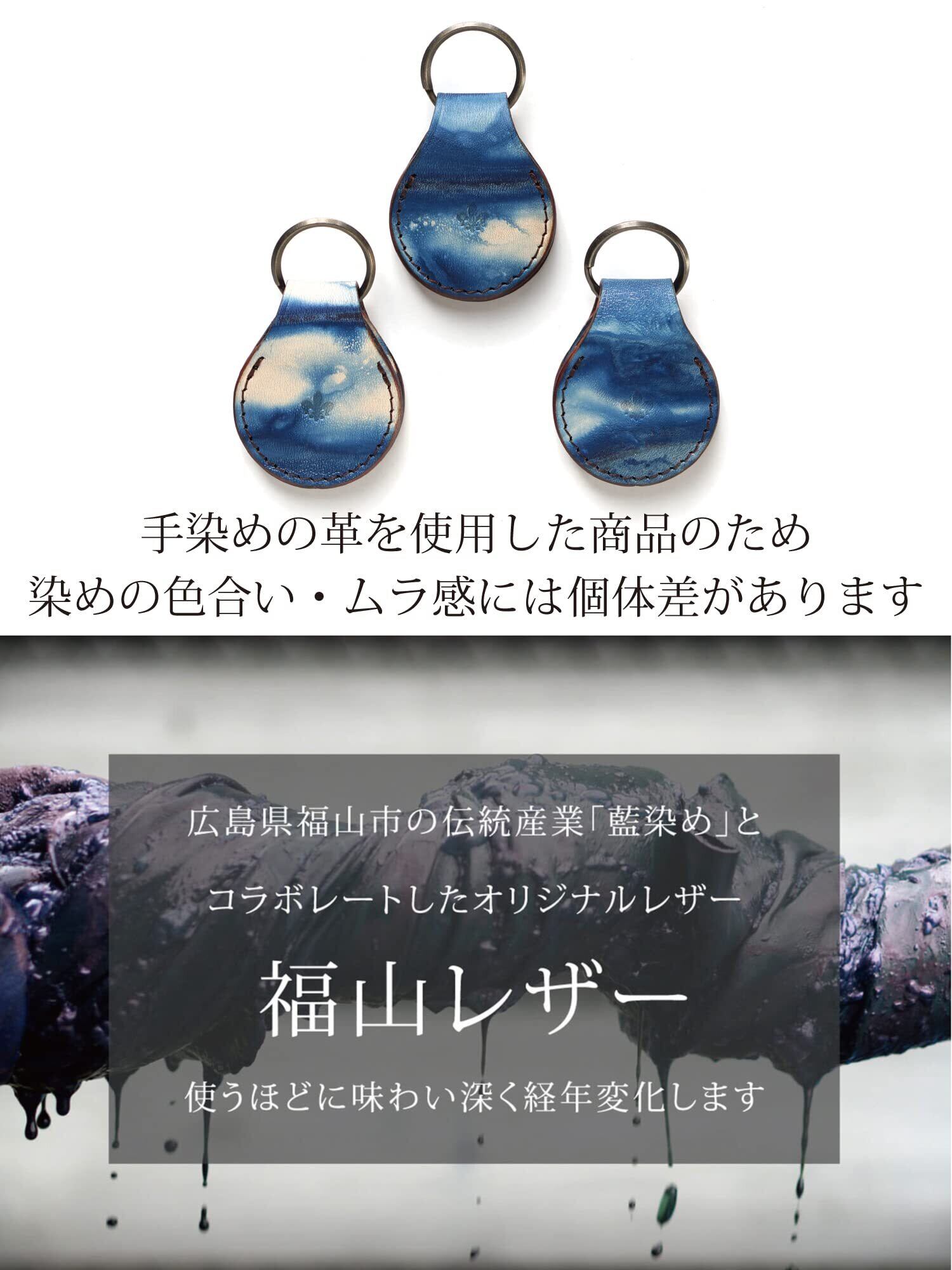 表地には福山レザー(藍染め本牛革)を使用し、裏地や中パーツなどにも本牛革を使用した正真正銘の牛革製キーホルダーです。職人がこだわって厳選した国産の牛革を、天然藍染料で染め上げた「福山レザー」は使い込むほどに味わい深く経年変化します。