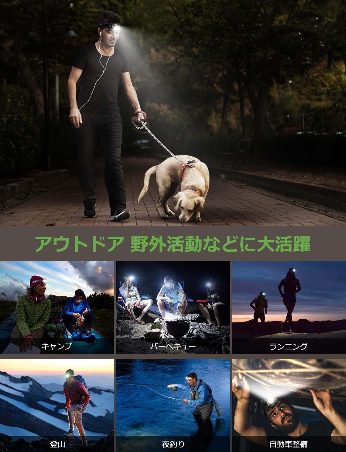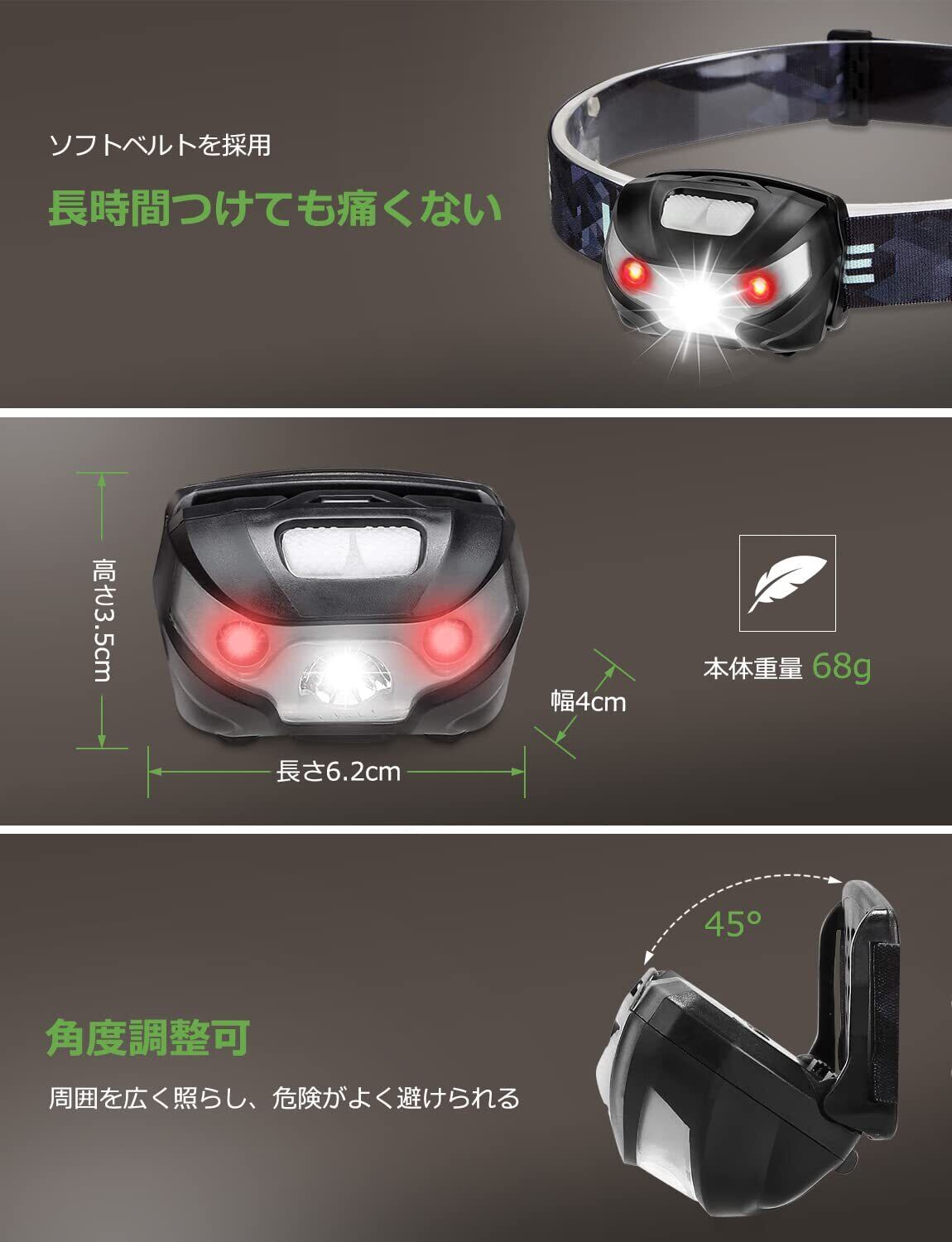 【超軽量・フィット感・照射角度調整可能】ヘッドランプ本体の重さは約68gと非常に軽量です。ソフトベルトを採用され、夜釣りなどの場合は長時間装着しても首にストレスを与えません。また、ライト本体の先端は45度までの照射角度調整に対応しており、足元だけではなく周囲も広く照らし、危険がよく避けられます。