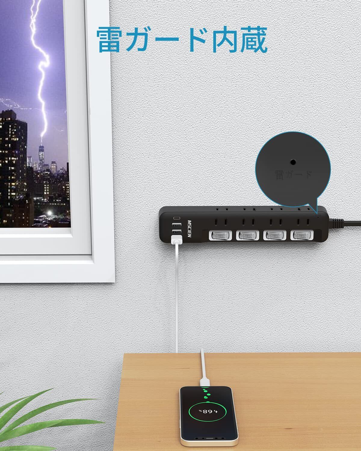 Mscien 電源タップ usb付き 8個AC口 1個usbc 3個usba 延長コード 2m 雷ガード コンセント oa スイッチ付き 壁掛け たこあし テーブル マルチタップ スイングプラグ ブラック (2M)