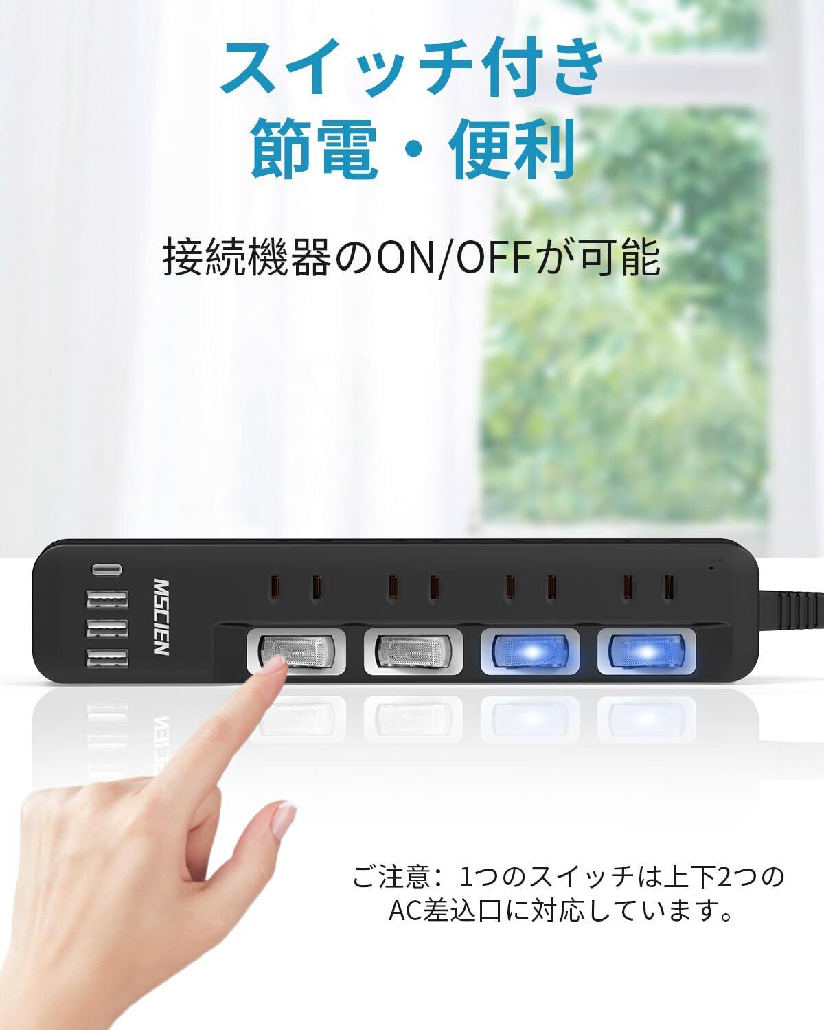 【スイッチ付き・節電・省エネ】コンセントには接続機器のON/OFFができるスイッチが付いており、使わないところは切って電力を節約することができます。スイッチLEDランプが付いており、一目で通電が見えて安心です。(※ご注意:各スイッチは上下2つのAC差込口を制御します。)