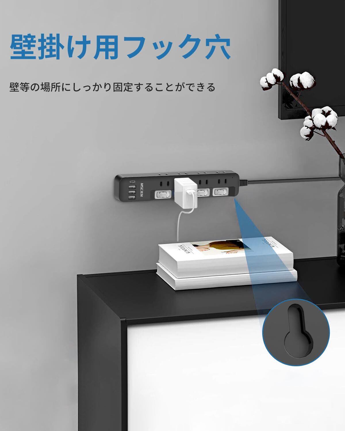 【壁掛けタップ・テーブルタップ】電源タップにはフック穴が付いており、壁等の場所に固定することができます。テーブルタップの底に滑り止めが付いており、使用がより安定しています。
