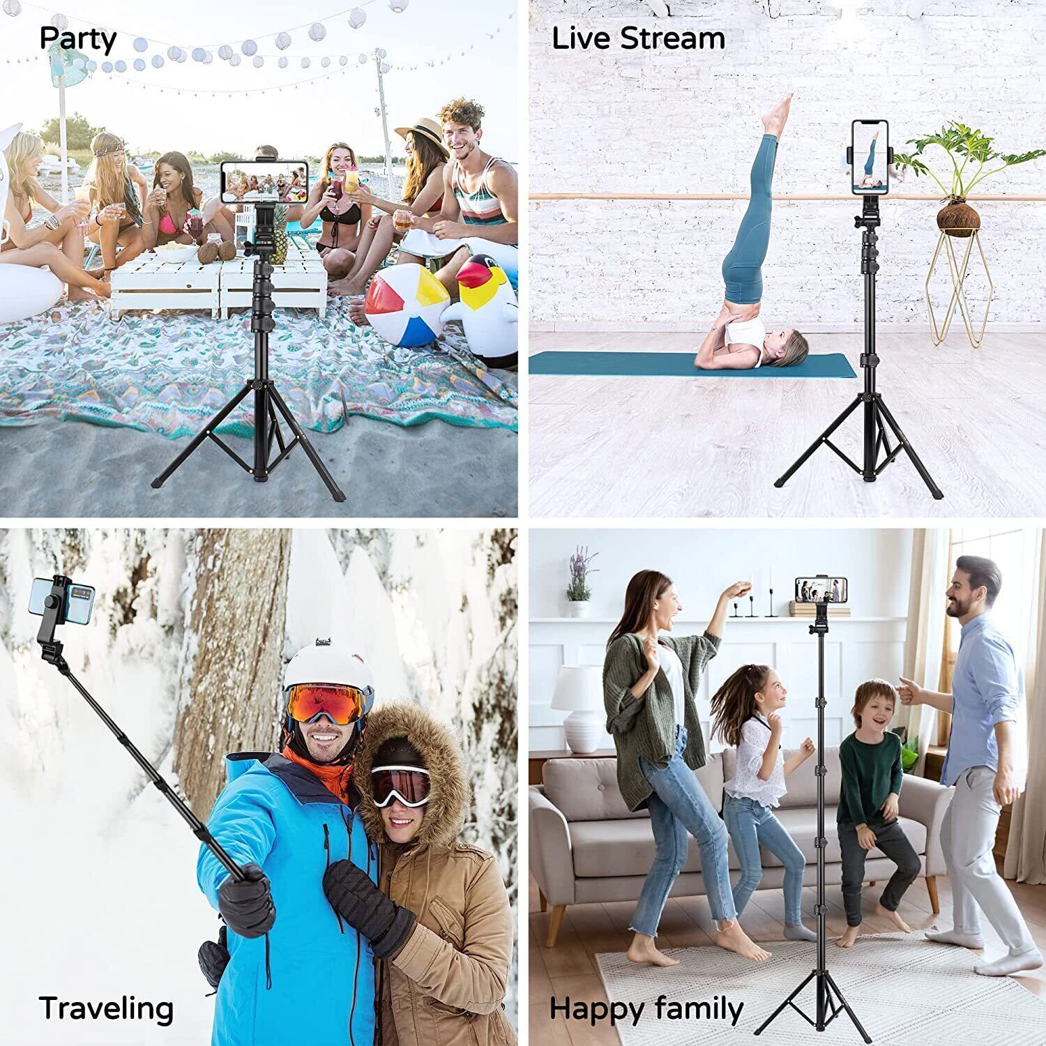 【2 IN 1自撮り棒 &三脚】 三脚と自撮り棒を一体化しているスマートフォン用三脚は、軽くてコンパクトに折りたため、アップグレードされたアルミニウム合金素材と折りたたみ可能な脚のデザインで作られており、わずか450gです。軽量で持ち運びが簡単で、旅行、パーティー、ハイキング、その他の屋内外のアクティビティに適しています