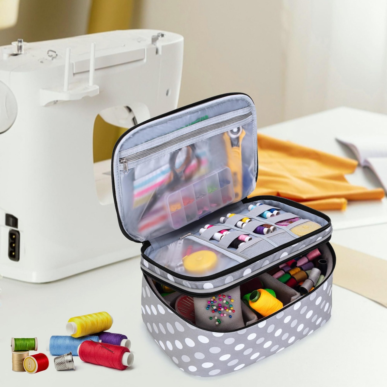 【機能】ソーイングに必要な道具を収納できる二層デザインです。小分けで、お裁縫道具を細かく収納することができます。