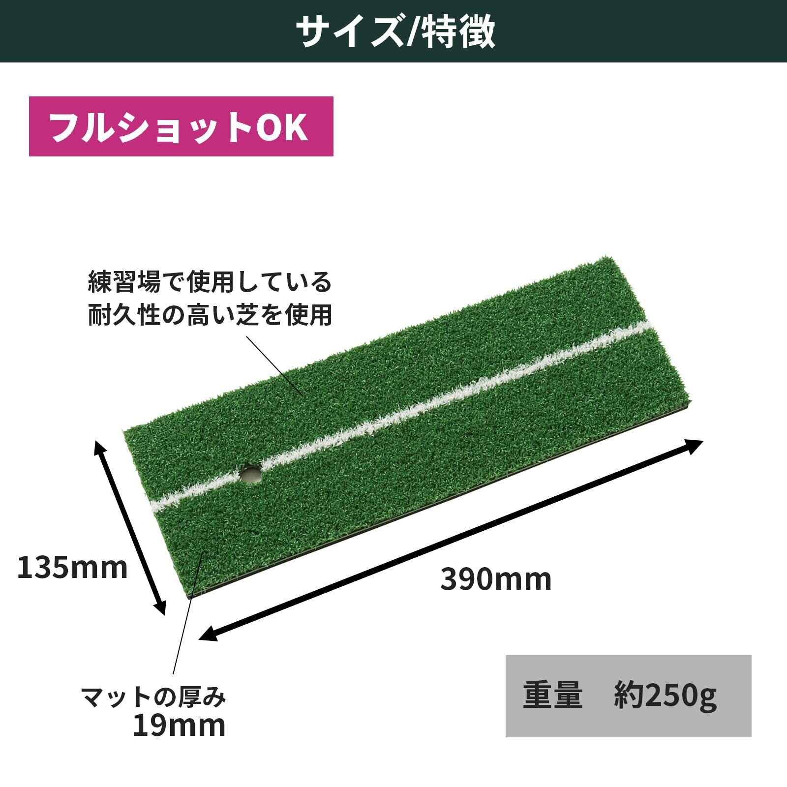 【マットサイズ】135㎜×390㎜【マット重量】約250g、持ち運びに便利なコンパクトサイズのゴルフマット。いつでもどこでも手軽にショット練習!