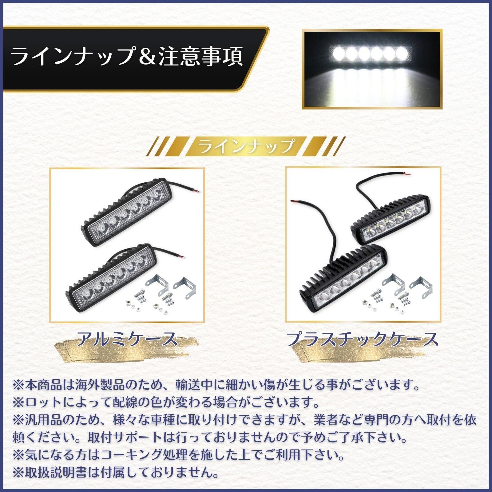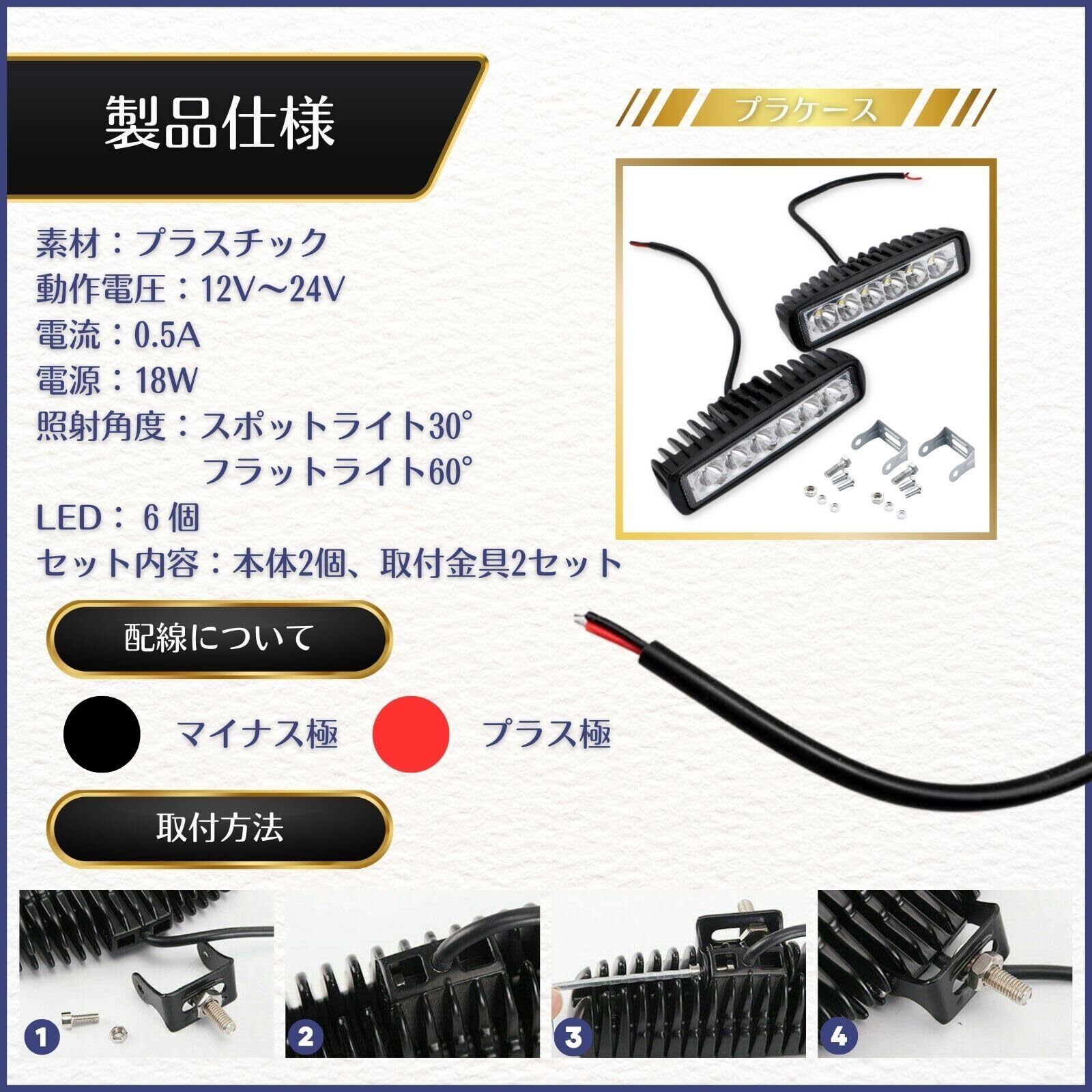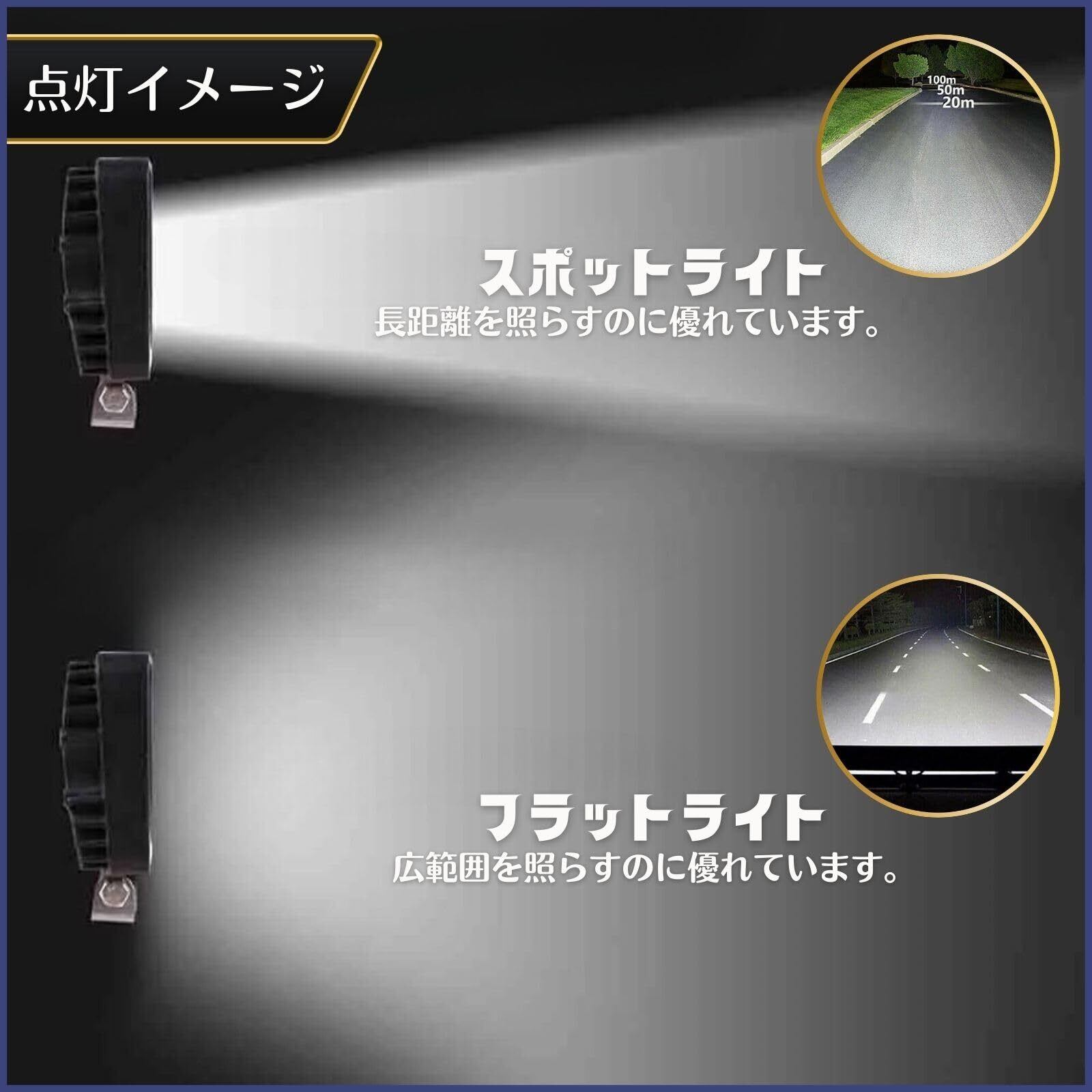 このワークライトは汎用性が高く、幅広い用途に対応しています。作業灯としてだけでなく、装飾用途としてもオススメです。カスタムカーなどのアクセントにもぴったりです。