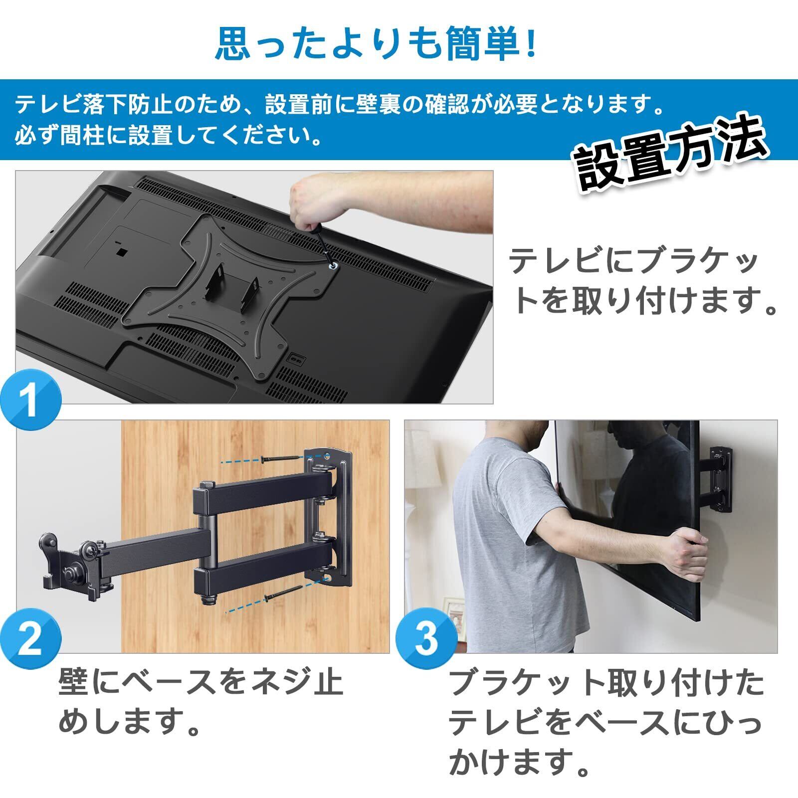 【思ったより簡単に設置】Step①部品がすべて揃っているかご確認ください。Step②テレビにVESAプレートを取り付けます。Step③壁に壁プレートをネジ止めします。Step④VESAプレートを取り付けたテレビを壁プレートにひっかけます。Step⑤テレビ壁掛け金具をお好みの角度に調節します。ご注意:商品の品質には十分注意を払っておりますが、初期不良、欠品、及び配送中の事故等での破損が生じた場合、返品や交換対応をさせていただきます。組み立てについて、何かご問題、ご不明な点がございましたら、ぜひ、ご遠慮なく、こちらに連絡してください。