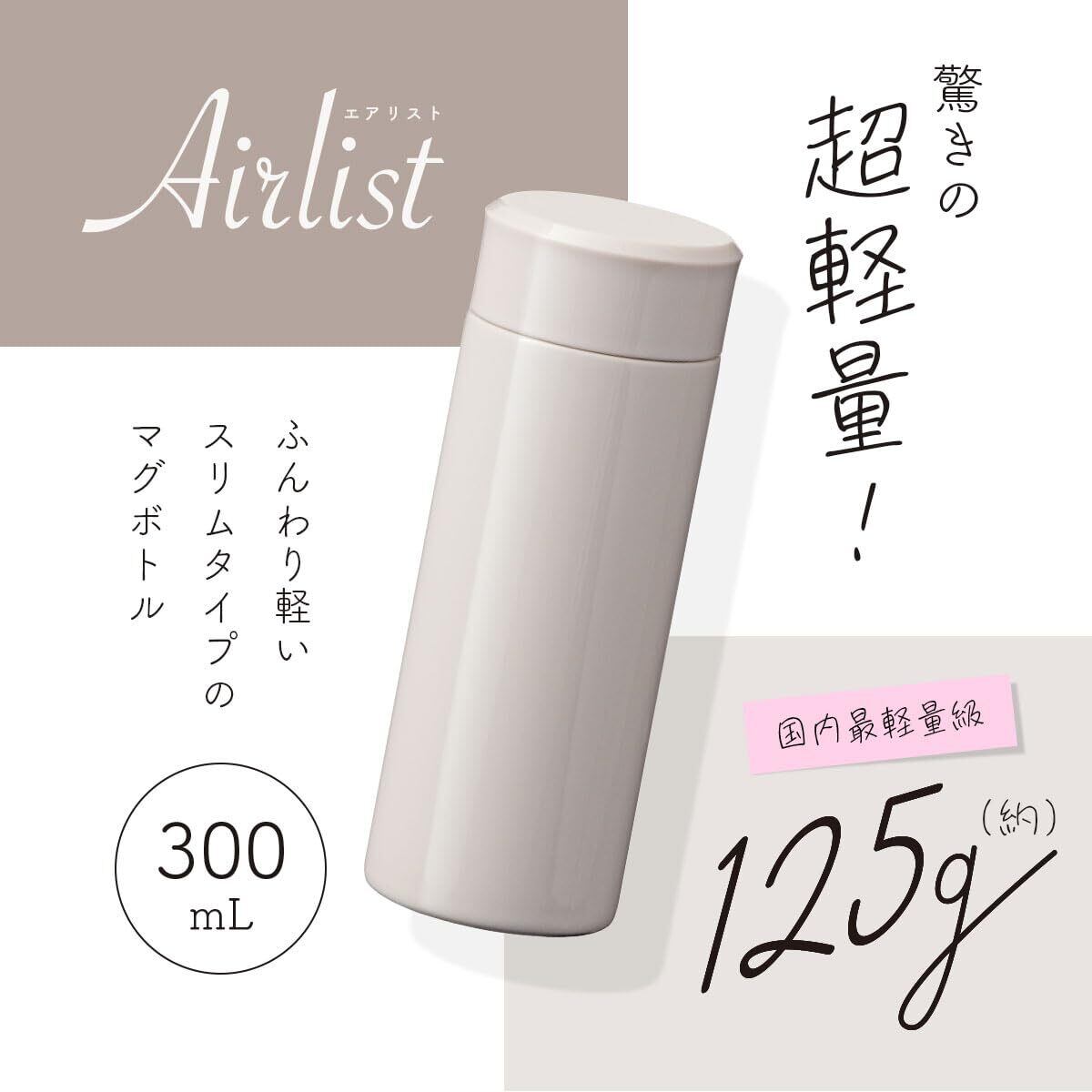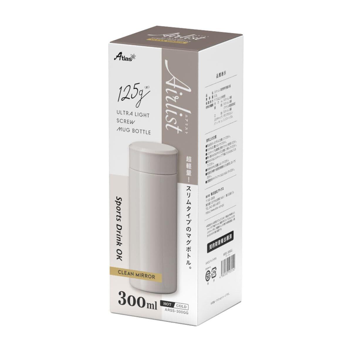 アトラス 水筒 300ml 保冷 保温 真空断熱 ステンレス 超軽量 マグ ボトル スリム 小さい ミニボトル スポーツドリンク対応 魔法瓶 直飲み グレージュ Airlist エアリスト ARSS-300GG