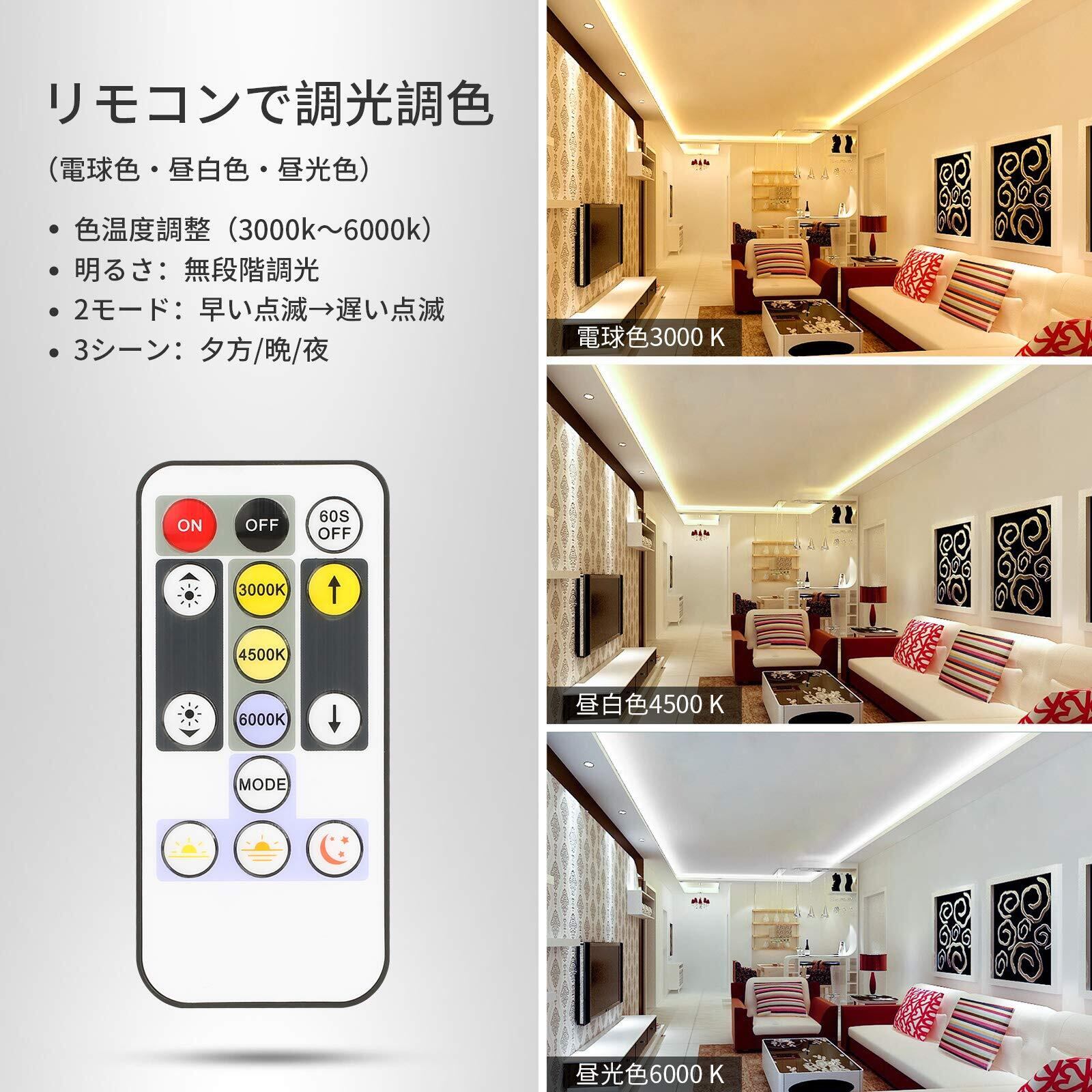 【リモコンで調光調色】幅広く細やかな色温度3000k~6500kまで調整が行えます。完全な白はもちろん、 白よりの電球色や微妙な昼白色、昼光色、温白色も鮮明に実現可能!(ご注意:初使用時、リモコンの絶縁シートを取り外して操作してください。)