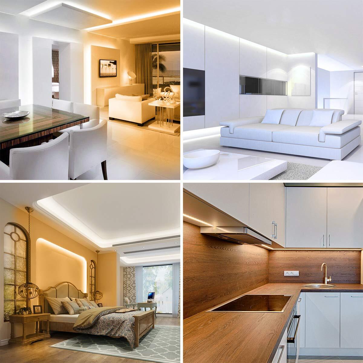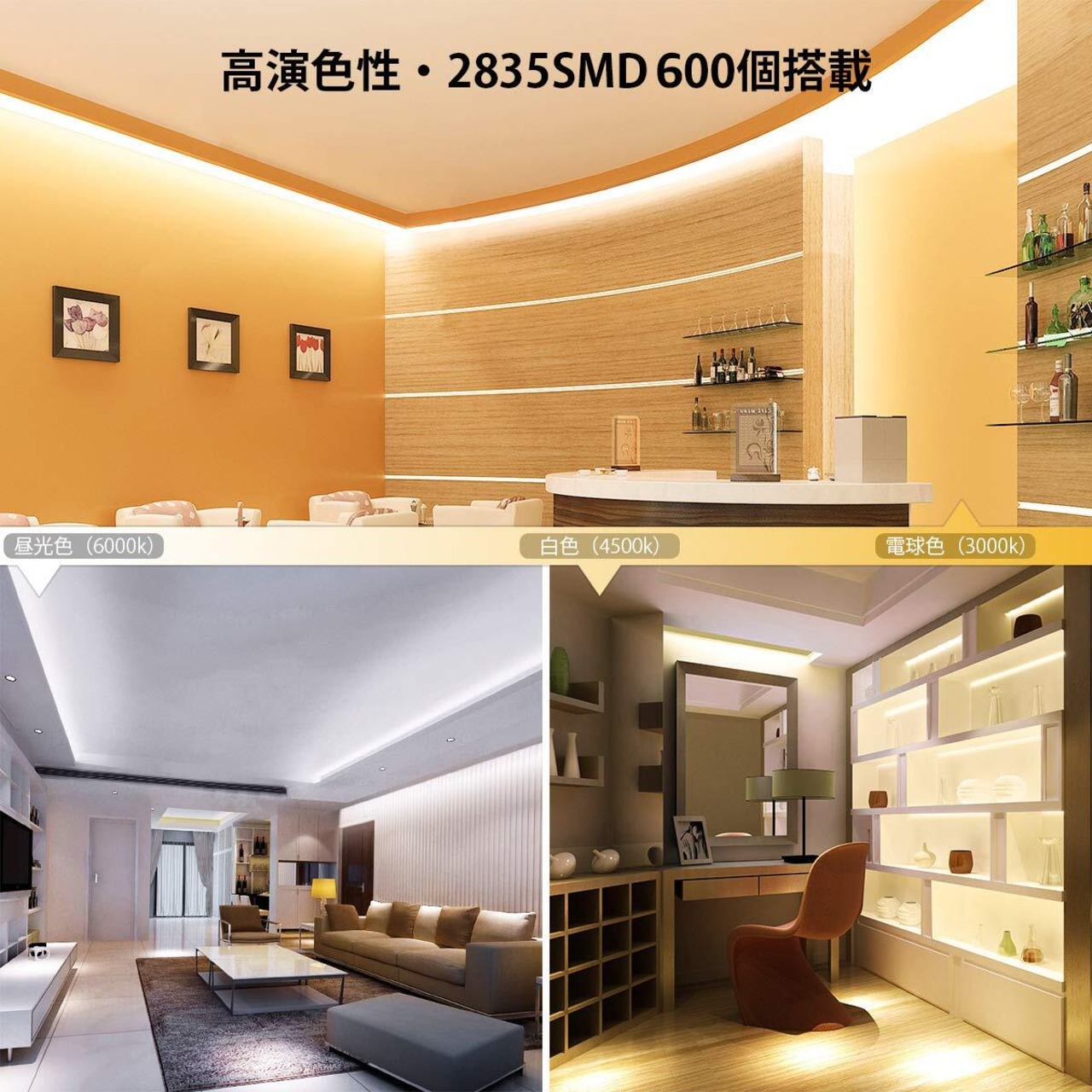 【2色LEDテープライト】今までなかったLED2色を組み込む構造により、光が点ではなく美しい一線に見え、電球色から白色への鮮やかで滑らかな変化を実現します。間接照明として最適で、壁を照らす、天井を照らす、床を照らすなど使い方は様々です。