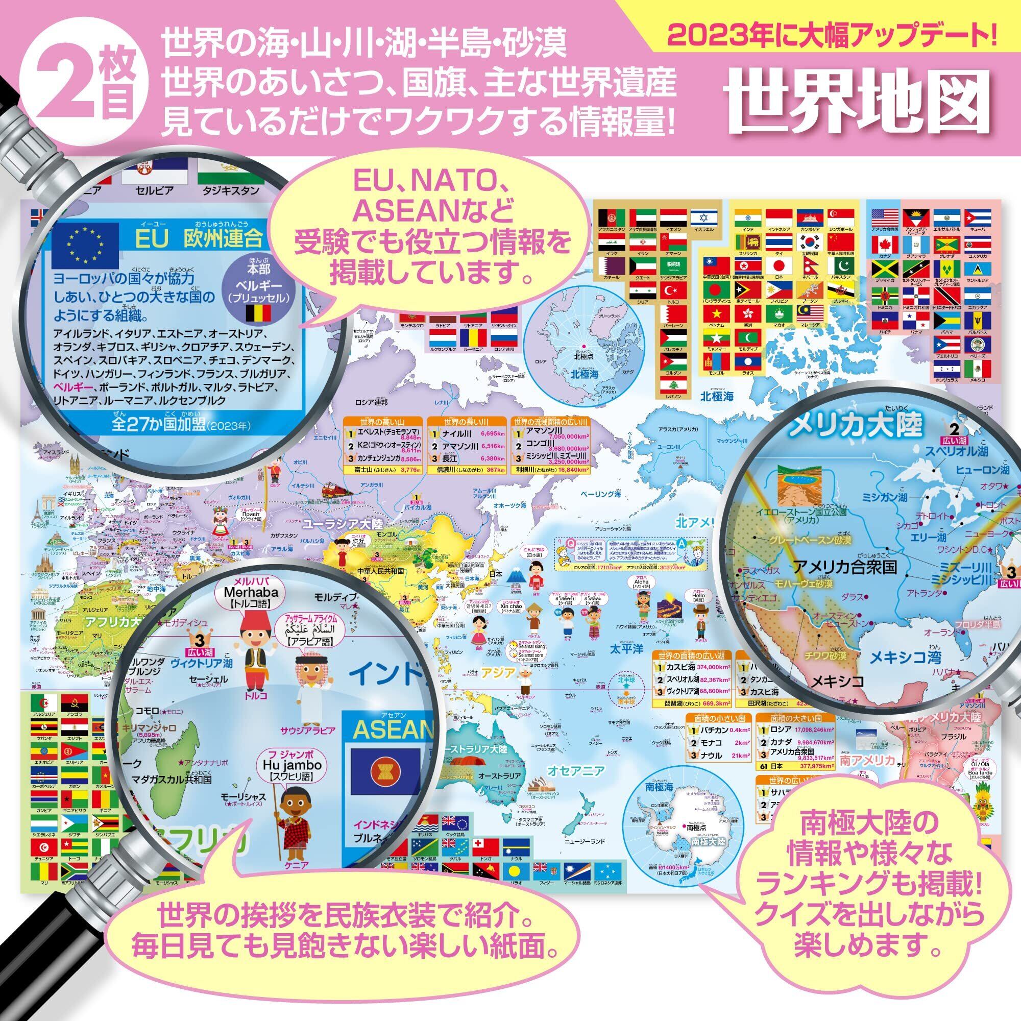 世界地図:各国の国旗と主要都市、ランドマークが地図に表示され、国際的な理解を深めます。旅行計画や国際関係の学習に役立ちます。世界各地の自然環境や動植物、国際機関や組織の情報も詳述。地理と生物学、国際関係を統合的に学べる豊富な情報量です。