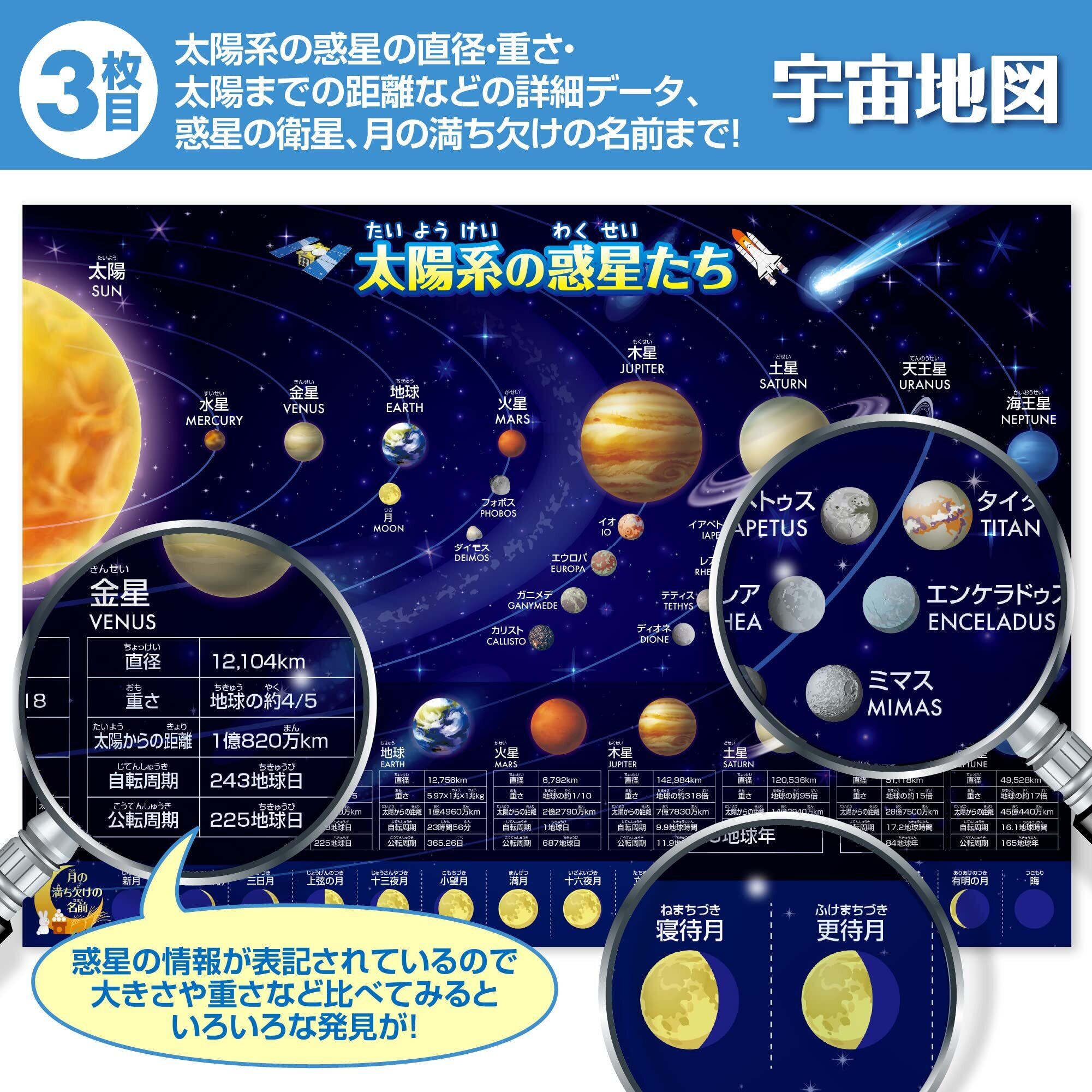 太陽系惑星地図:太陽系全体の構造が視覚的に理解でき、各惑星の詳細なデータが満載。月の満ち欠けや探査機の情報もあり、天文学の基礎から応用まで網羅しています。