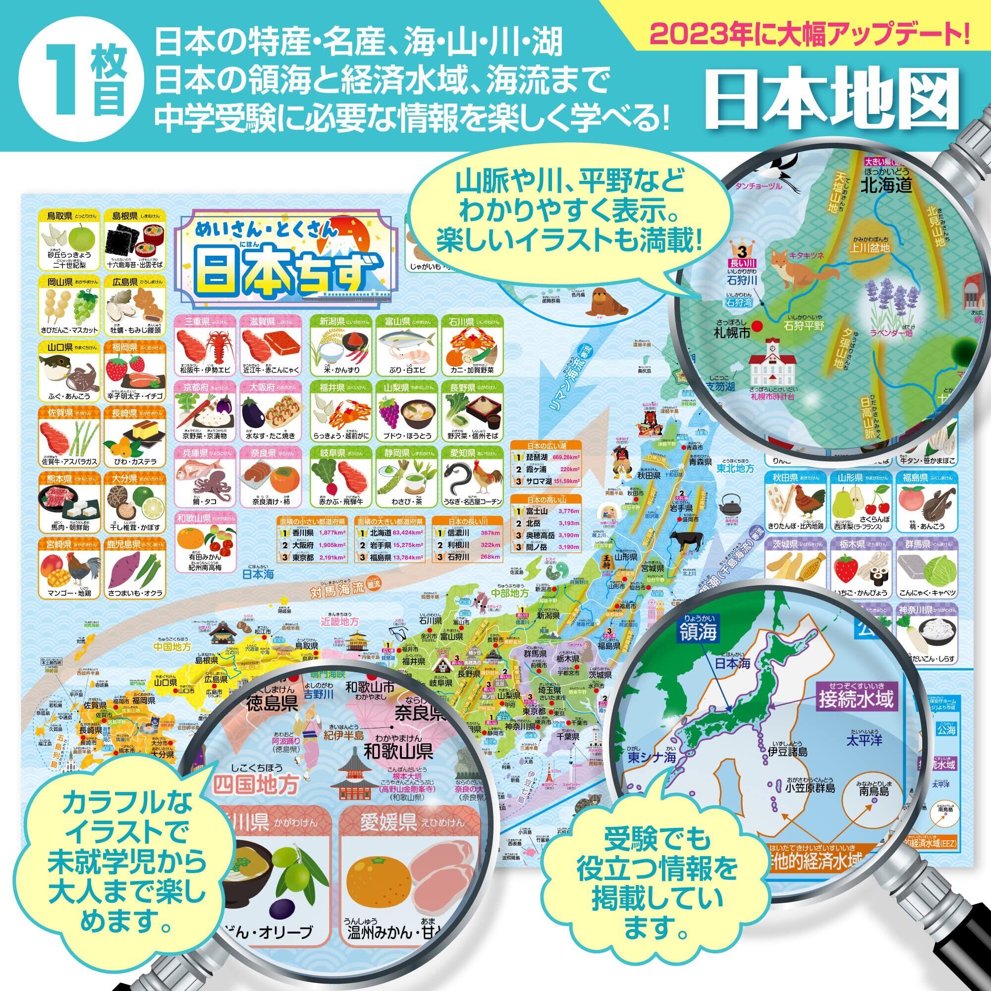 日本地図:各地域の特産品や名所がイラストで表示され、一目で理解できる構成。食べ物や名所を学びながら日本各地の文化と地理を楽しく学べます。山脈、川、湖などの地理的特徴が明確に描かれ、各県の面積や人口情報も掲載。視覚的に地理データを学びやすい設計で、学習に最適です。