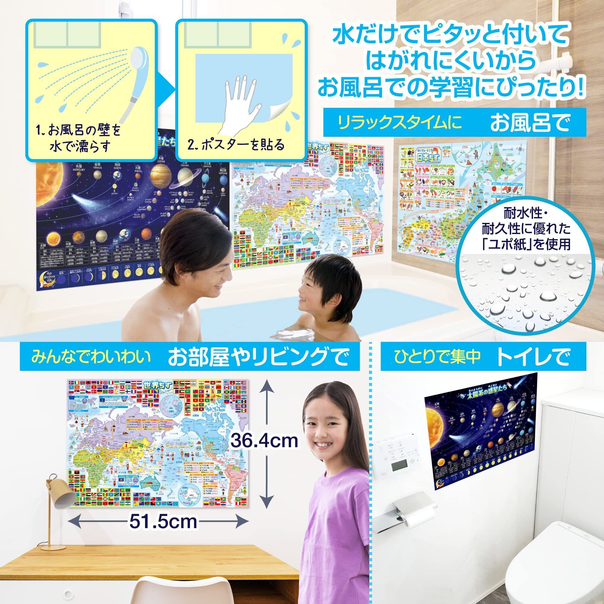 お風呂の学校 日本地図&世界地図&宇宙地図(太陽系)お風呂ポスター 3枚セット 日本製 B3サイズ 地理 社会 知育 学習 防水