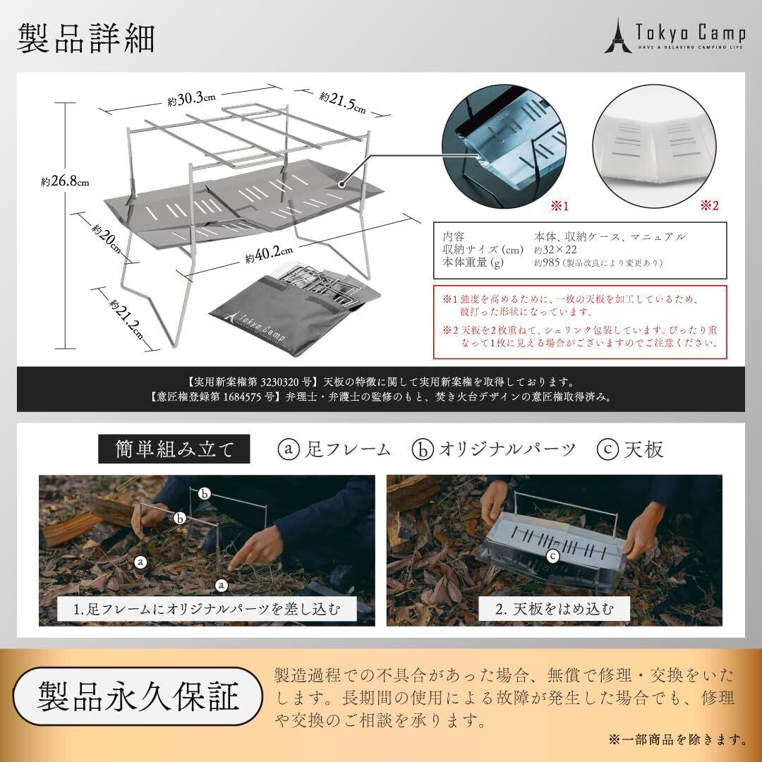 【軽量・コンパクト&高耐久】重さ約985g、収納サイズは約32×22cm。軽量かつ薄型の設計で、車載・ザックにも楽々収納可能。厚みのあるステンレス素材を採用し、繰り返しの使用や高温にも耐える“変形しにくい”焚き火台です。