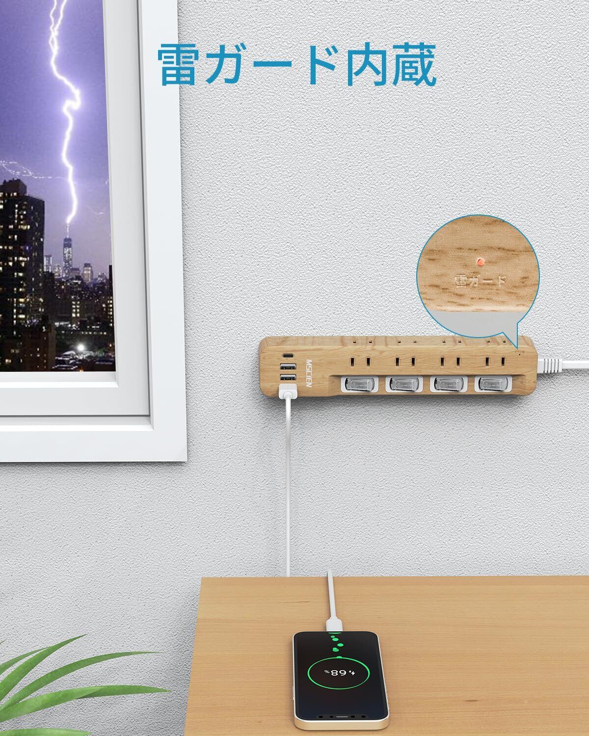 Mscienエムサイン 延長コード 2m 電源タップ usb付き 雷ガード 8AC口 3usb-a 1usb-c マルチタップ スイッチ たこあしコンセント 分岐 oa テーブルタップ スイングプラグ 壁掛け 木目調 蛸足コンセント