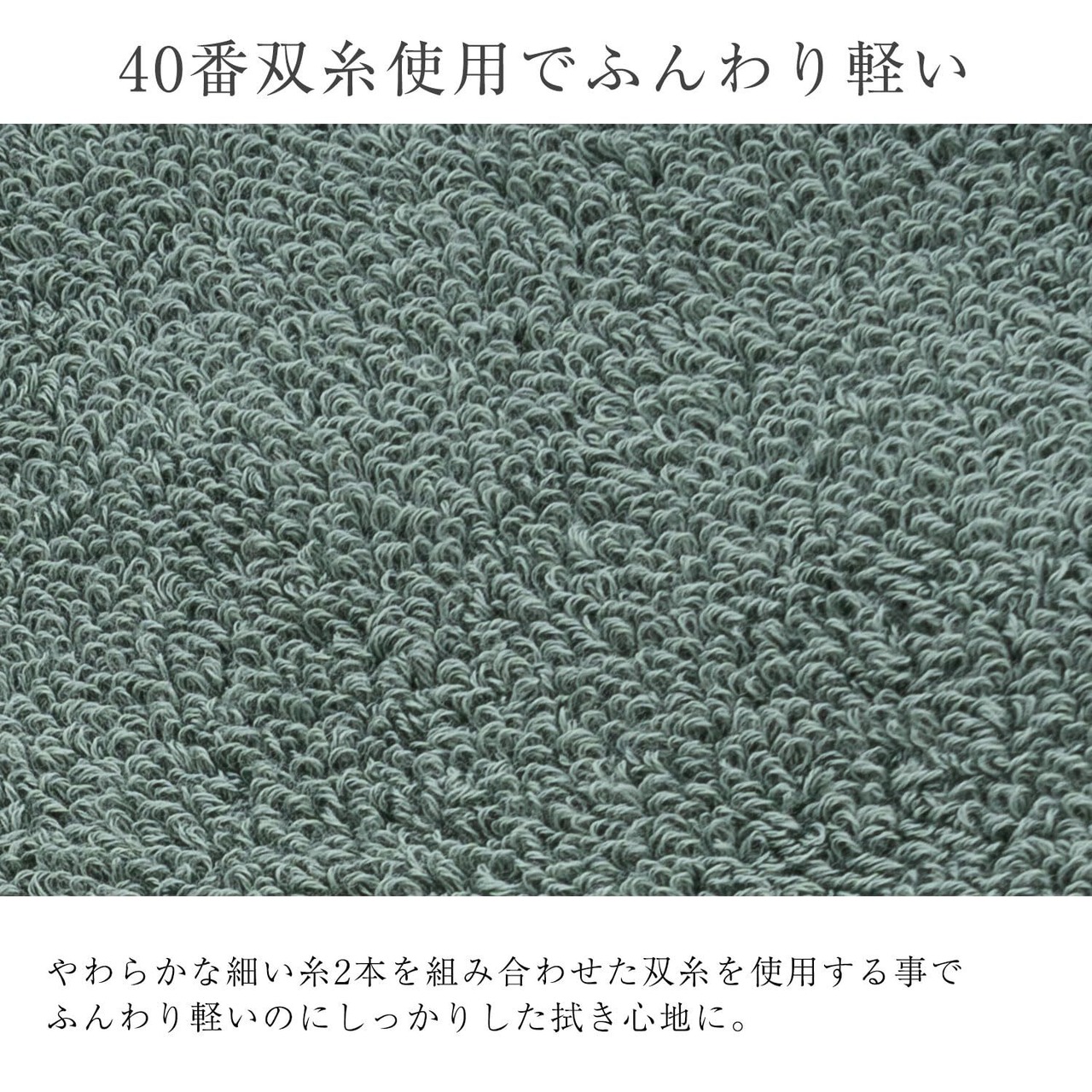 【タオルの要 糸へのこだわり】きめ細かな40番手糸を甘く撚り合わせた糸を使用しました。双糸仕上げなので、耐久性が高く長持ちするだけでなく甘撚りすることによって柔らかい肌触りと拭き心地も実現しています。