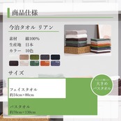 【商品サイズ・重さ】フェイスタオル:34×80cm、約103g バスタオル:70×130cm、約320g【カラー】ベージュ、ブラウン、グリーン、グレー、ネイビー、オフホワイト【素材】綿100%【生産地】日本(今治)【今治認定番号】第2018-144号