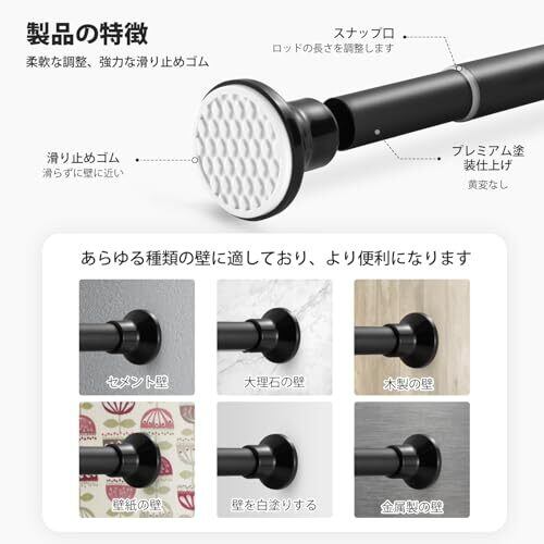 【色んな場所で大活躍】伸縮棒はタイルの壁面だけではなく、木製壁などの表面にも使用できます。湿気の多い梅雨季節でも普通の時でも、シャワーカーテンロッド、バスルーム衣類用ロッド、室内クロゼットロッド、カーテンロッド、DIY棚、布団干し、屋外物干しなど様々なシーンで活用できます