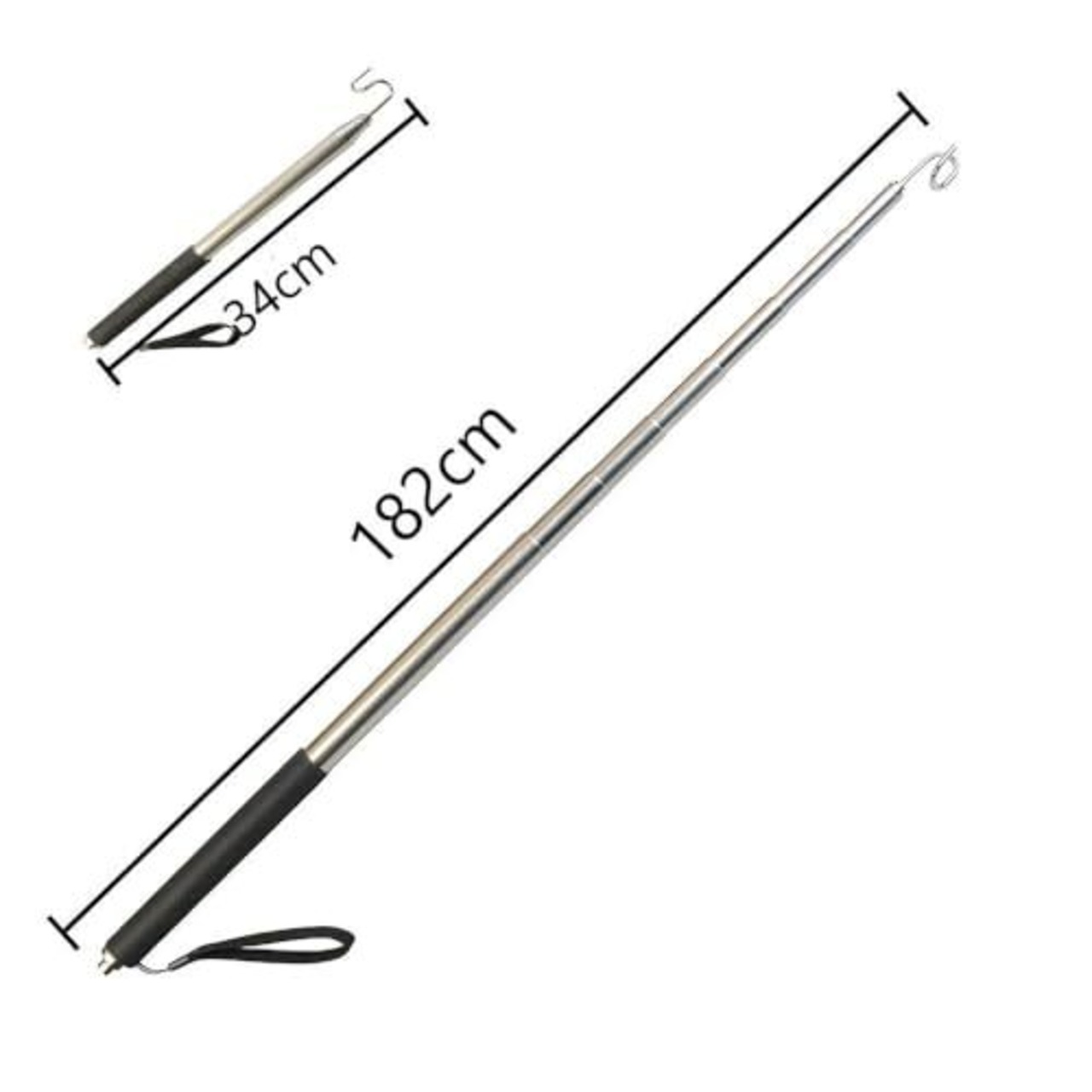 【丈夫な伸縮式】伸縮部はサビに強いステンレス製で丈夫。最長:1.82m 収納時長さ:34cm。重量:0.2kg