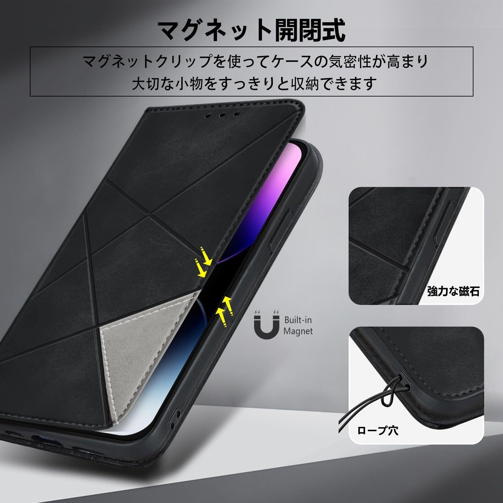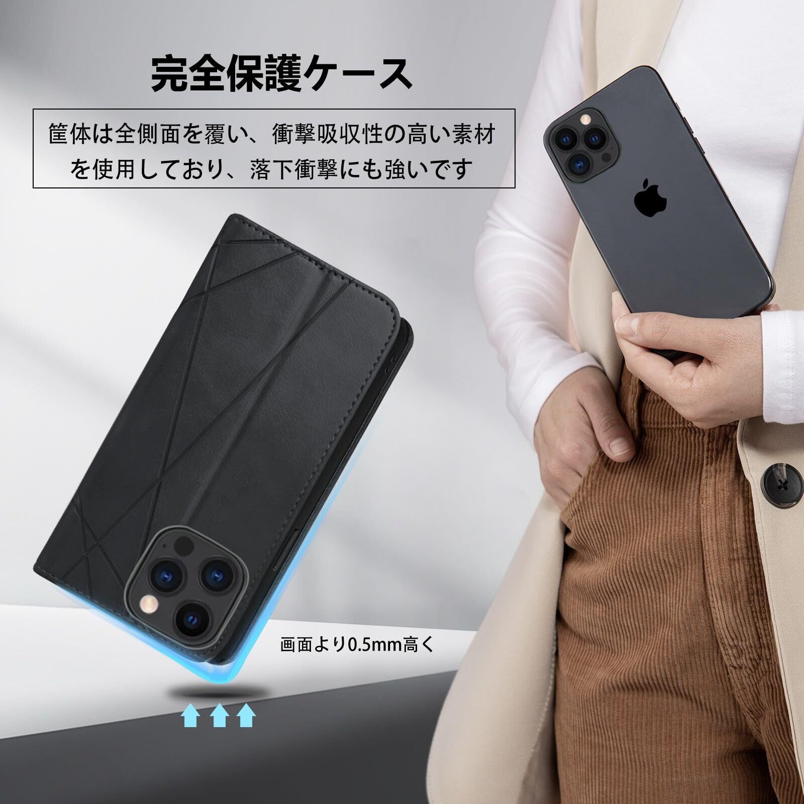 【全面保護】このあいふおん14Pro手帳型ケースレンズ保護部位本体より高く、擦り傷を最小限に抑えることができます。高耐衝撃構造で作られ、熟練の技術に裏付けられたクッション加工、落下衝撃を全方位吸収し、期待に裏切らない頑丈さを持つ。落下の衝撃から重要なスマホを守ってくれます。衝撃に強く、日常生活での消耗に耐えしっかり保護できるので、落下や衝撃による損傷を軽減します。