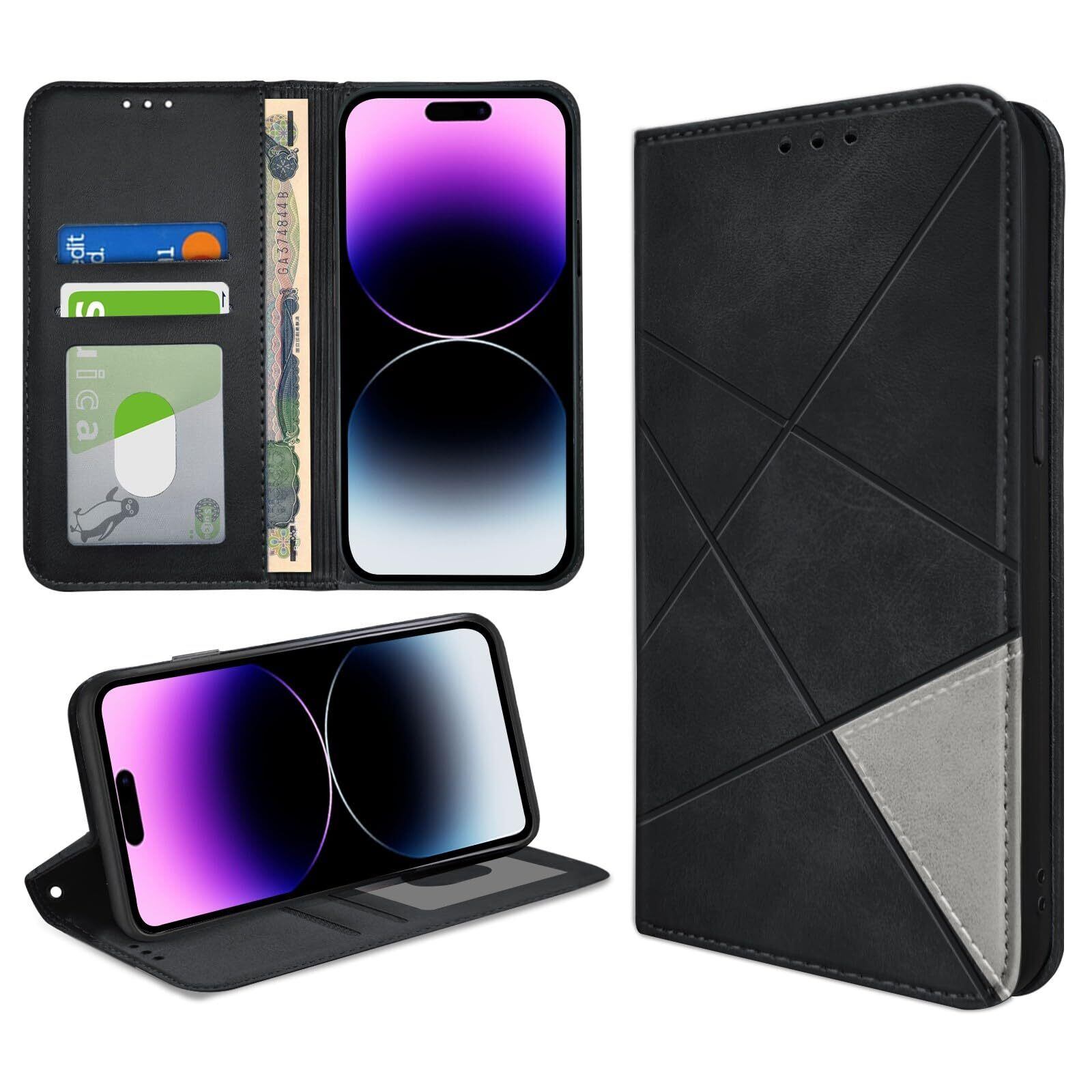 bjnosdv iPhone 14 Pro ケース 手帳型 高級PUレザー マグネット式 アイフォン14 Pro 財布型 カバー 耐衝撃 スマホケース 横置きスタンド機能 カード収納 小銭入れ レンズ保護 擦り傷防止 落下防止 ストラップホール付き 6.1インチ(ブラック)