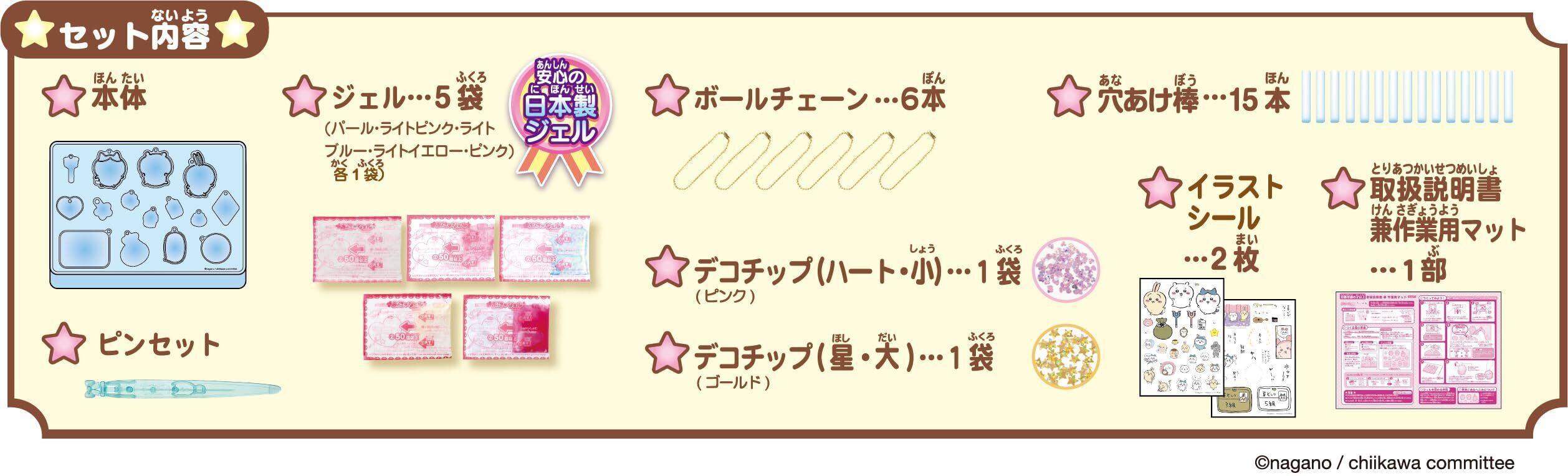 ブリスター型本体:1個、ジェル:5袋、デコチップ(ハート・小/星・大):2袋、穴あけ棒:15本、イラストシール:2枚、ピンセット:1本、ボールチェーン:6本、取扱説明書兼作業用マット:1部