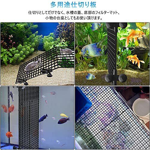 【商品仕様】パッケージ内容:タンクセパレーター×4枚+ゴム吸盤×4個,セパレーターサイズ:30×15cm,格子サイズ:約1×1cm、小さい魚は通り抜ける可能性があるのでご注意ください。