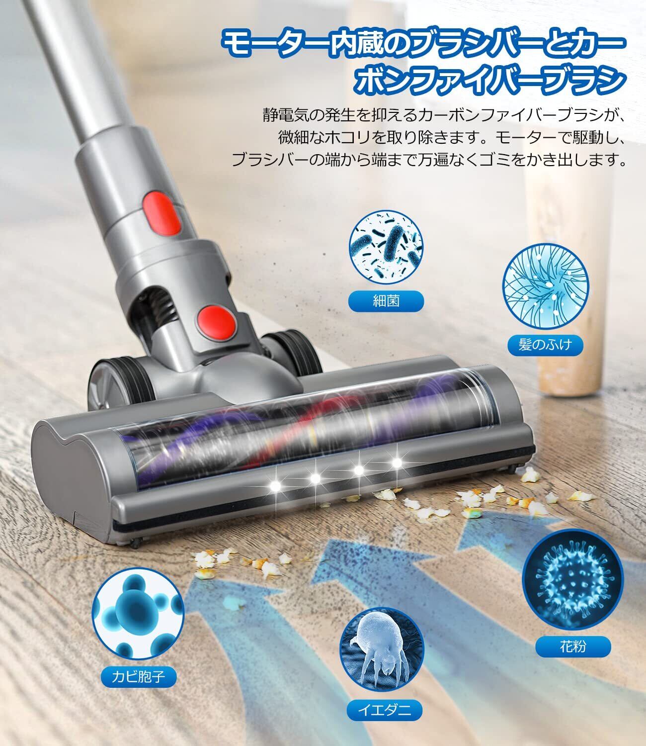 【キレイに掃除】:ダイソン掃除機ヘッドは、ナイロン製のブラシとカーボンファイバーブラシの組み合わせ。ナイロン製のブラシがカーペットの繊維の奥深くまで入り込み、ホコリや毛をかき出します。また、柔らかいカーボンファイバーブラシが静電気を抑え、繊維にくっついた細かいホコリまで掃除します。