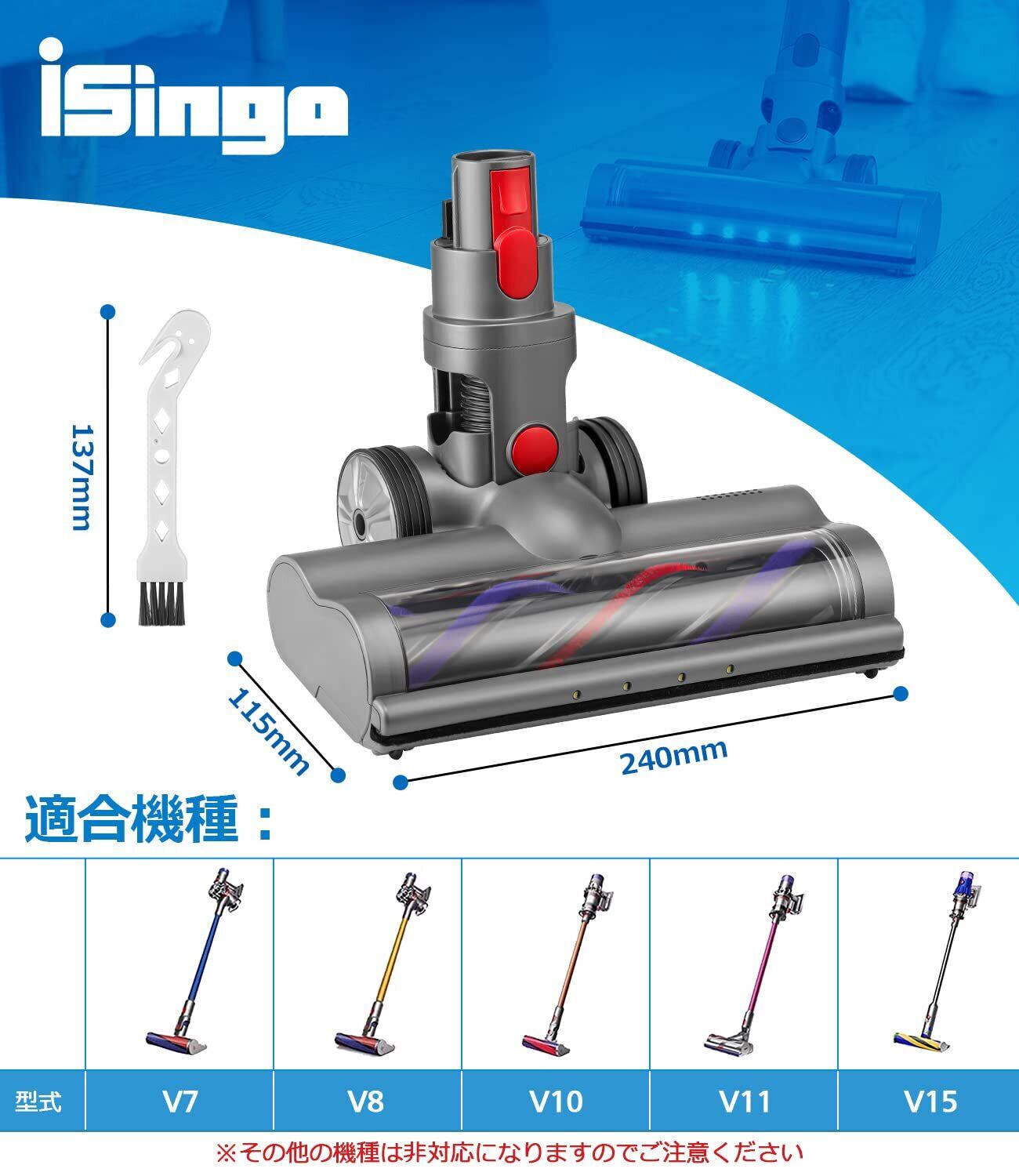 【対応機種】:ダイソン V7(SV11)、V8(SV10)、V10(SV12)、V11(SV14)、V15(SV22)シリーズ専用 モーターヘッド(Slimは一部非対応) ※その他の機種は非対応になりますのでご注意ください。サイズ:240mm x 115mm / 重量:約1173g(ヘッド部分だけ)。