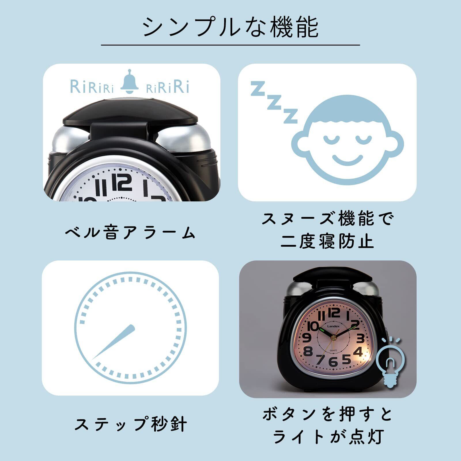 ランデックス(Landex) 目覚まし時計 黒 スターベルゼット アナログ 大音量 ベル音 スヌーズ ライト付き YT5306BK