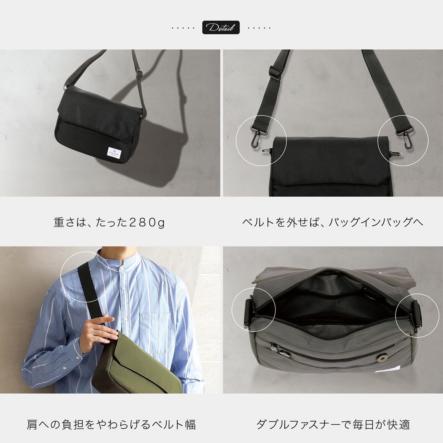 【 軽い・おしゃれ・ベストサイズ! 】「出かける時は意外と荷物が増えてしまう…結構物が入るショルダーバッグが欲しい!」「今のカバンはたくさん物が入るけど…重たいから左肩が凝る…」「どんな服のコーディネートにも合う肩がけバッグを探している!」 このような悩みで普段使いのカバン・バックを探している方はいらっしゃいませんか? 長財布・スマホ・たばこ・ペットボトル・ハンカチ・ティッシュ・折りたたみの傘など、休日に持って歩きたい物って結構たくさんありますよね? でもいざそれらを持ち運ぶとなると…カバンは必然的に大きくなりますし、重たくなって身体への負担も大きくなりますよね。それに休日に身に着けるバッグなら、どんな服にも合ったオールマイティーなショルダーバッグが良いとお思いではありませんか? そんなあなたに是非使ってもらいたいのが、このBLUE SINCEREのショルダーバッグです。 .