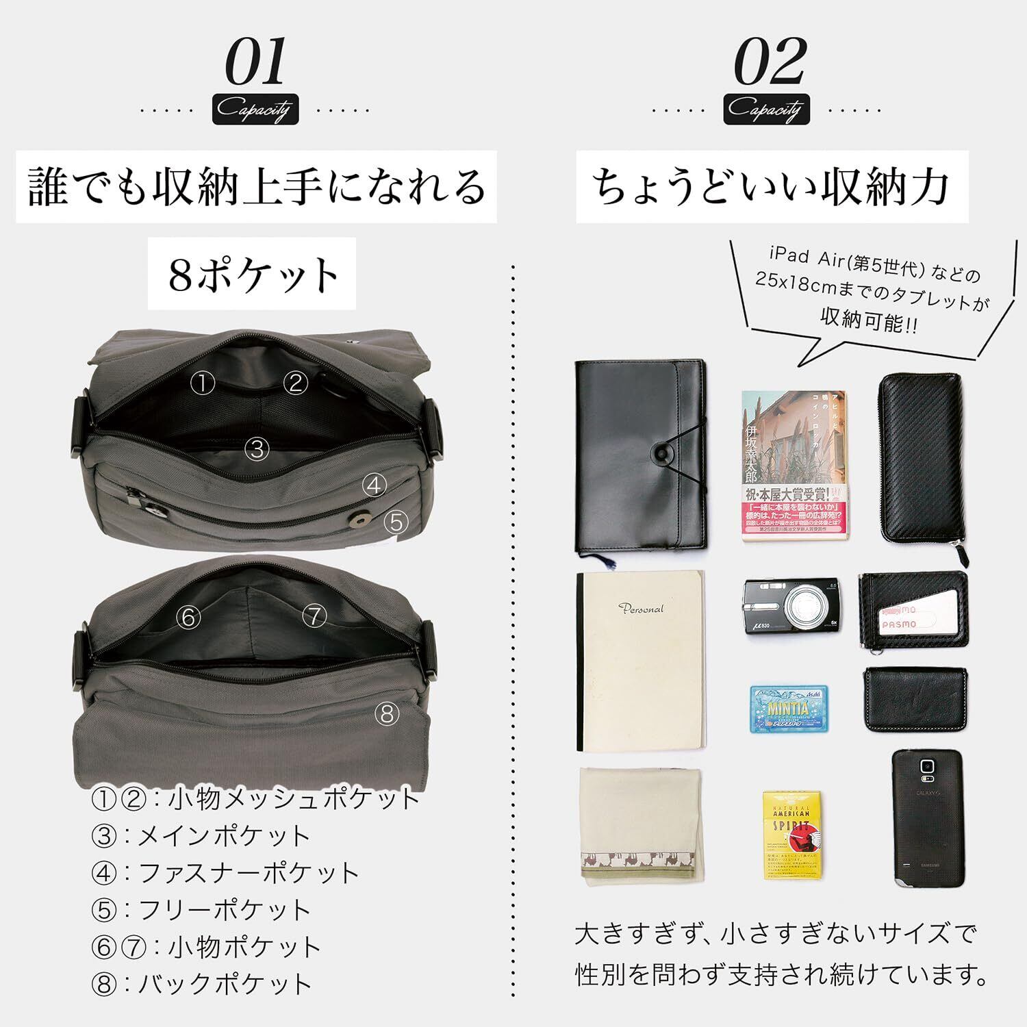 【 一泊くらいの旅行に・お出かけカバンに 】「自分は普段は荷物をあまり持たない」という方でも、例えば服や下着の替えは歯ブラシセットなどを入れれば日帰りや一泊くらいの旅行なら問題なく行けるでしょう。また、海外旅行でのサブバックとしても大変重宝するでしょう。BLUE SINCEREのショルダーバッグを旅に連れて行ってください。また様々な働き方が存在する昨今において、私服で通勤して仕事をするという方も多いと思います。 薄くて軽くて小さいタブレット端末はもちろん、B6、A5サイズのノートも入れることができます。通勤途中の電車の中で読書をするためにパッとipad miniを取り出したりと、ビジネスシーンでもきっと重宝するでしょう。 .