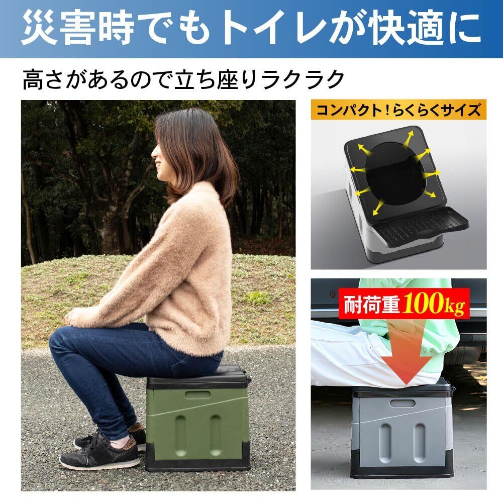 【軽くて、折りたためて、コンパクト】約1.3㎏ととても軽量で、持ち運びのしやすい簡易トイレです。折りたたむことでコンパクトになるので、非常用として押入れや車のトランクに収納しておいても邪魔になりません。また、簡易トイレとしてだけではなく、コンテナボックス、踏み台、イスなど使い方もさまざまで多くのシーンに使用できます。
